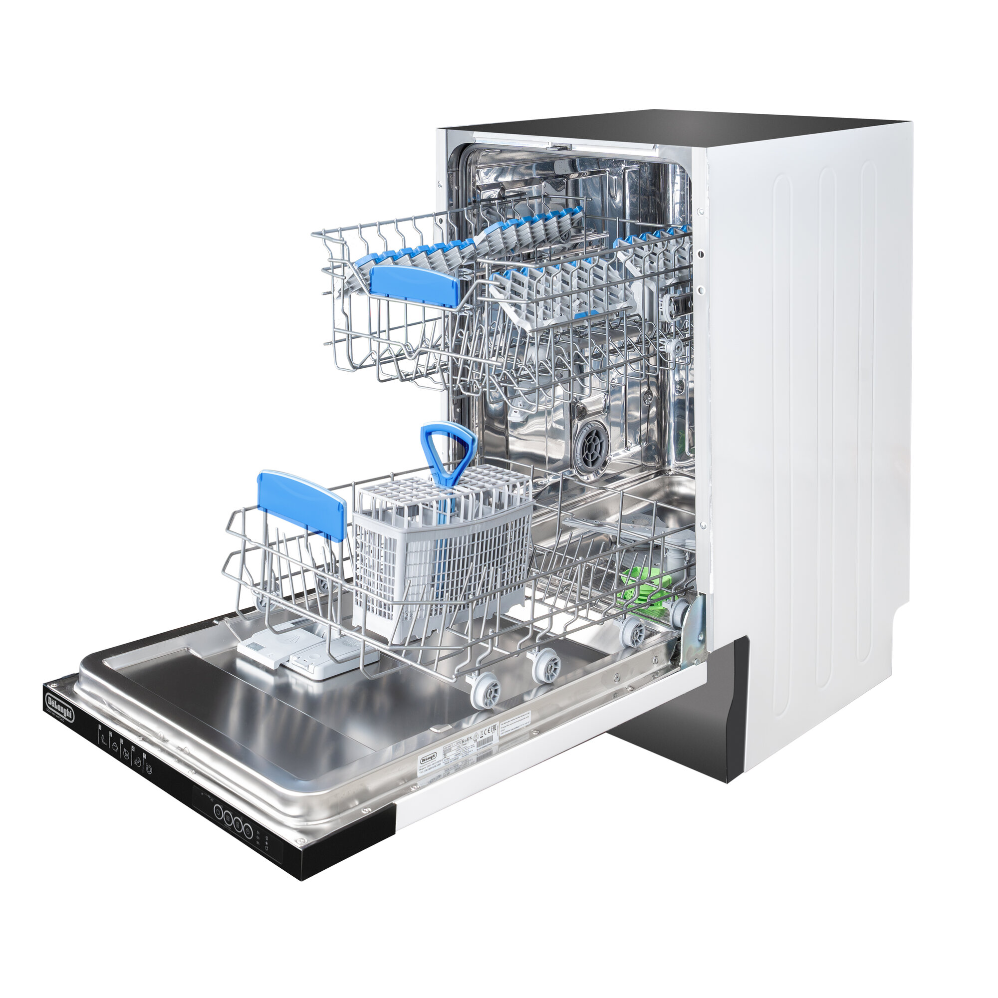 Встраиваемая посудомоечная машина 45 см DeLonghi DDW 08S Aquamarine eco, инверторный мотор, 10 комплектов, Aqua Stop, 3 корзины, сенсорное управление, встроенная посудомойка 45см
