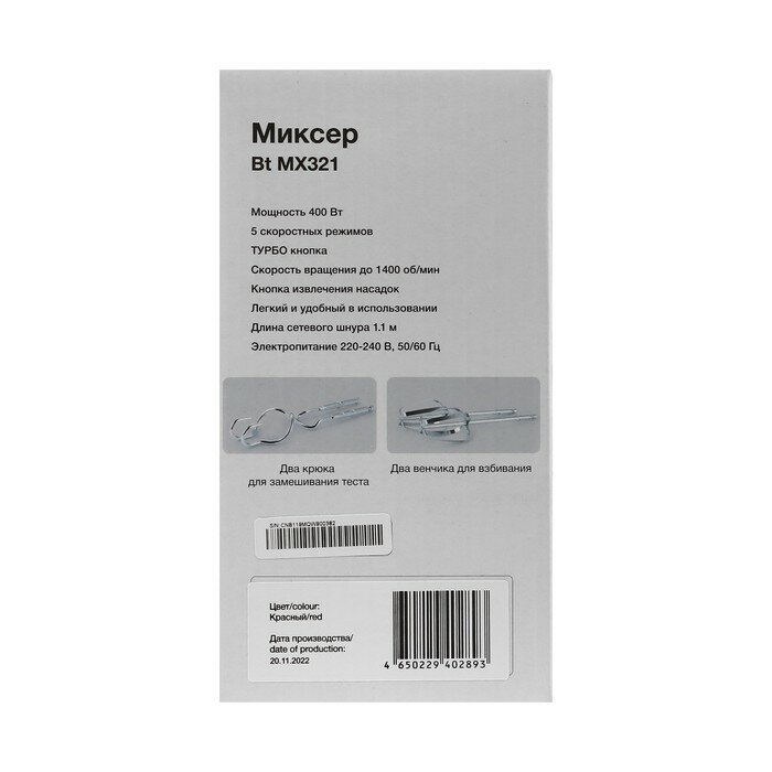Миксер Bt MX321, ручной, 400 Вт, 5 скоростей, красный