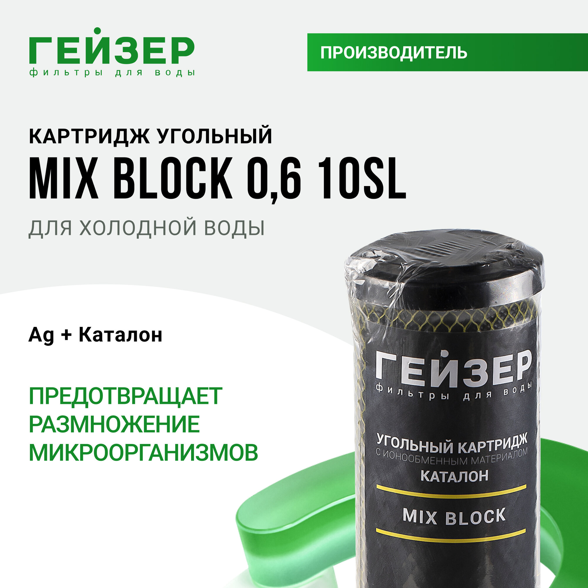 Картридж угольный Гейзер Микс Блок 0.6 мкм - 10SL, обеспечивает эффективную очистку воды от всех видов железа и тяжелых металлов, сохраняя природную минерализацию, 27132