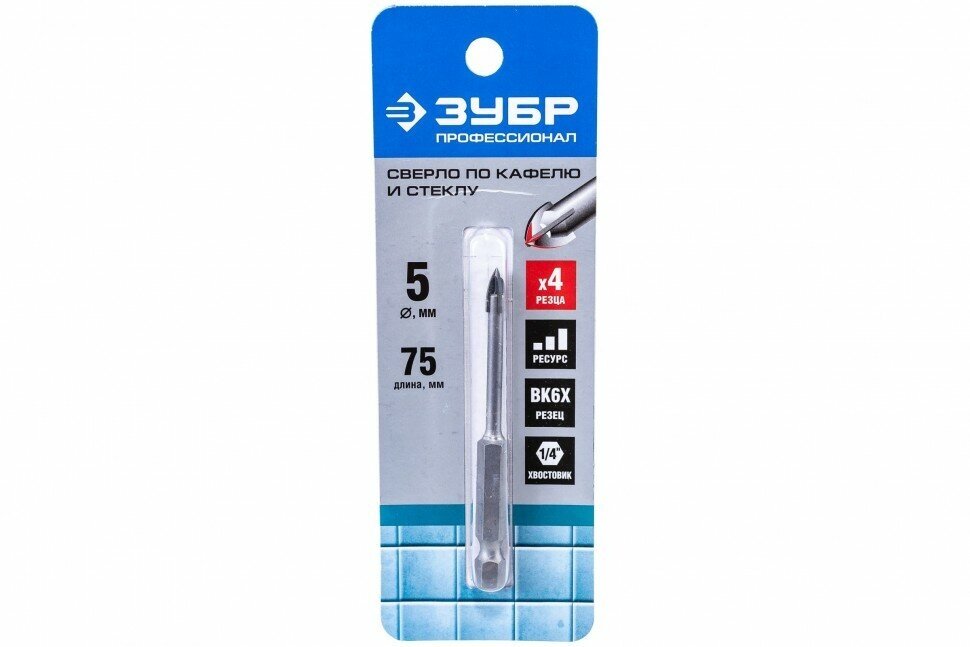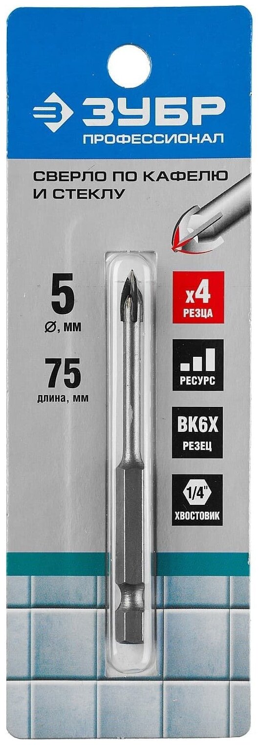 ЗУБР Ø 5 мм, 4-х резцовый, длина 75 мм, шестигранный хвостовик, сверло по стеклу и кафелю 29845-05 Профессионал