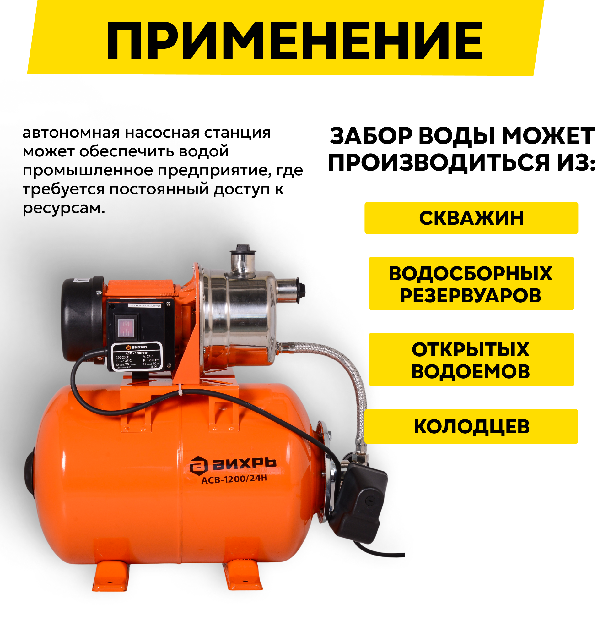 Автономная станция водоснабжения Вихрь АСВ-1200/24Н, 1200 Вт, напор – 40 м, 70 л/мин, гидроаккумулятор – 24 л интересное: