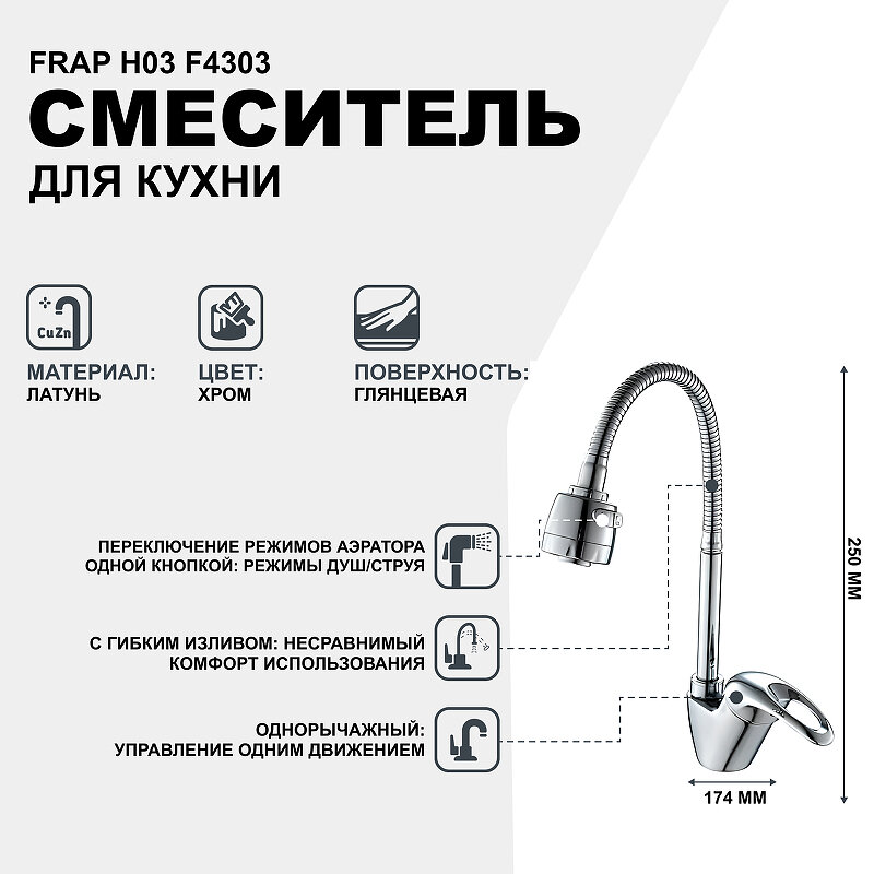 Смеситель для кухни Frap F4303, с гибким изливом, однорычажный, хром