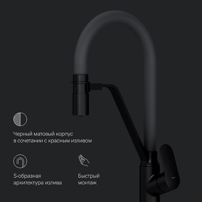 Смеситель для кухни AM.PM Like черный, с фильтром для питьевой воды, красный излив, технология Fresh Boost 2 в 1 управление одной ручкой, гибкий излив, латунь