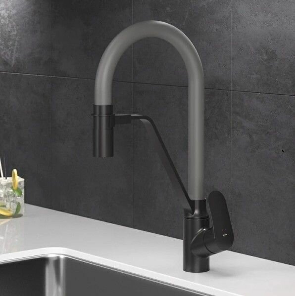 Смеситель для кухни AM.PM Like гибкий серый/черный излив, с фильтром для питьевой воды, технология Fresh Boost 2 в 1 управление одной ручкой, латунь