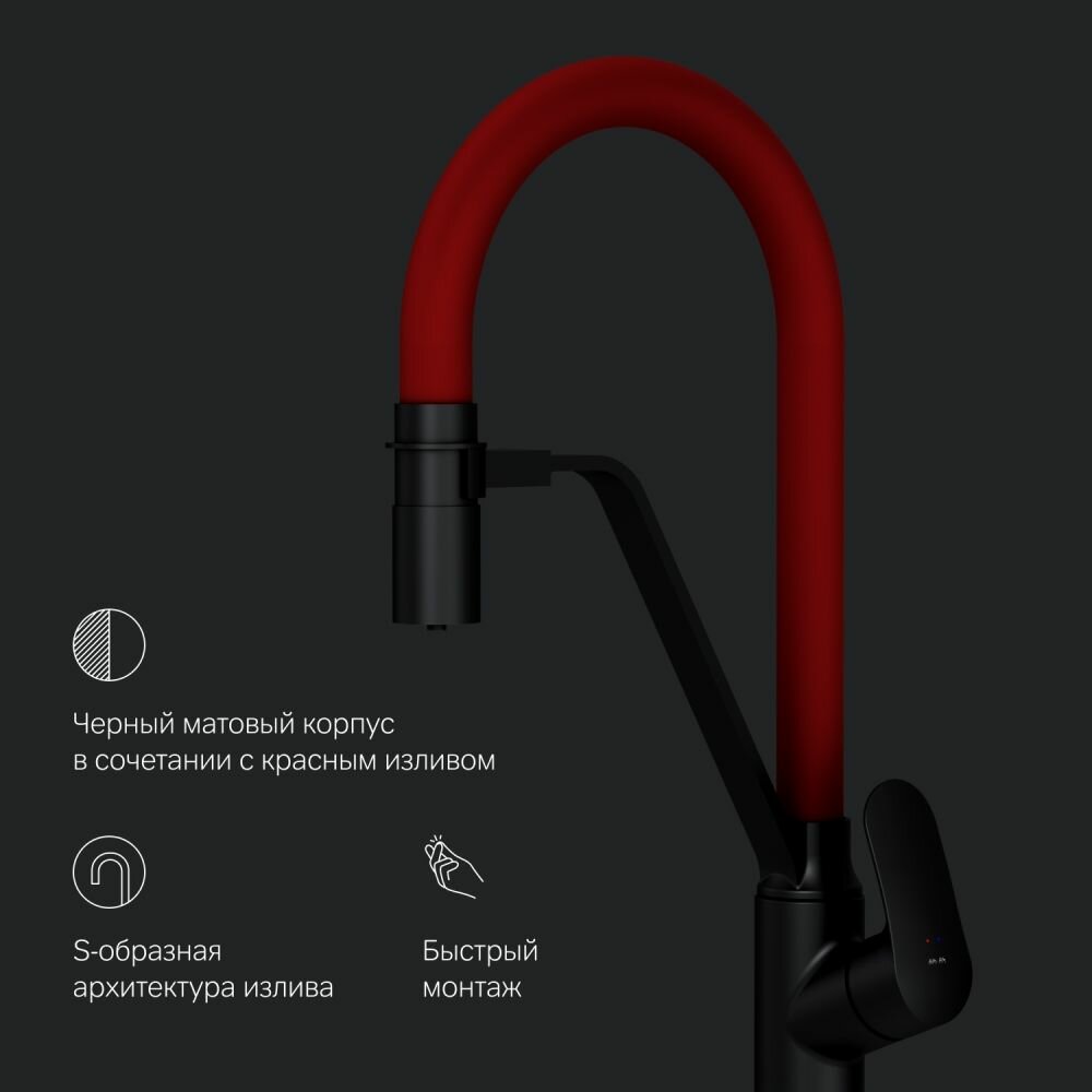 Смеситель для кухни AM.PM Like черный, с фильтром для питьевой воды, красный излив, технология Fresh Boost 2 в 1 управление одной ручкой, гибкий излив, латунь