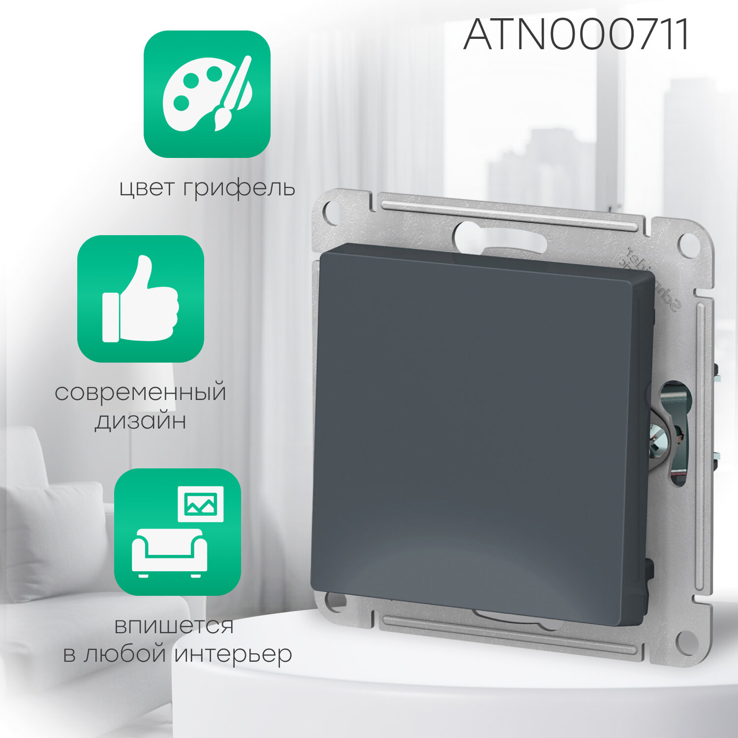 Выключатель одноклавишный с подсветкой (грифель), сх.1а, 10АХ, механизм Schneider Electric AtlasDesign (комплект 6шт)