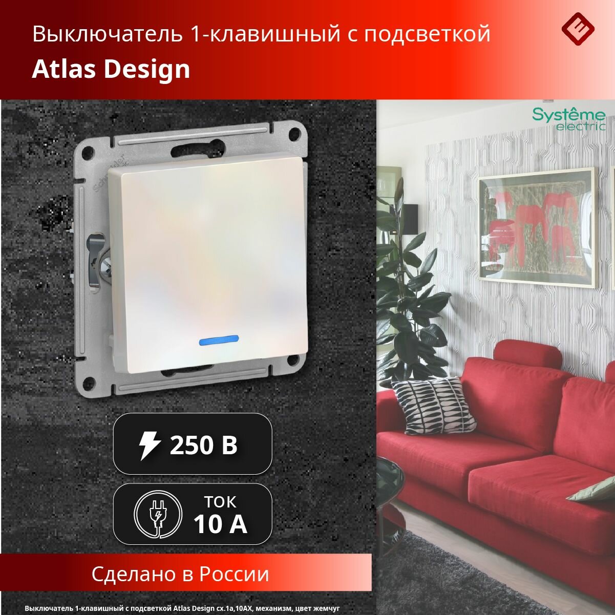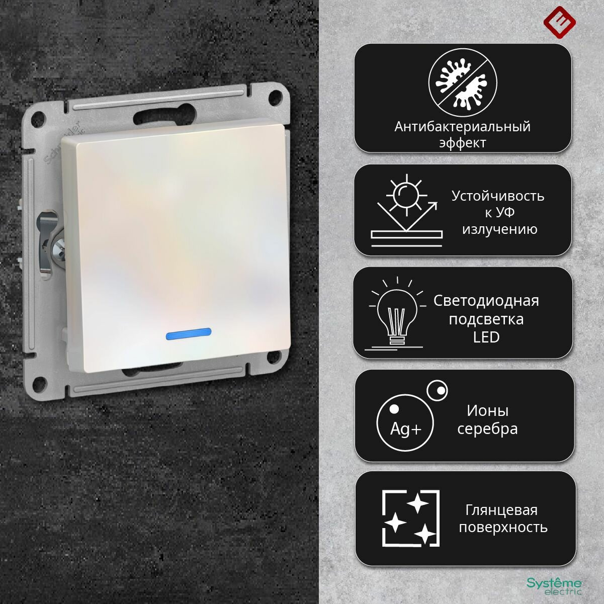 Выключатель одноклавишный с подсветкой (жемчуг), сх.1а, 10АХ, механизм Schneider Electric AtlasDesign (комплект 10шт)
