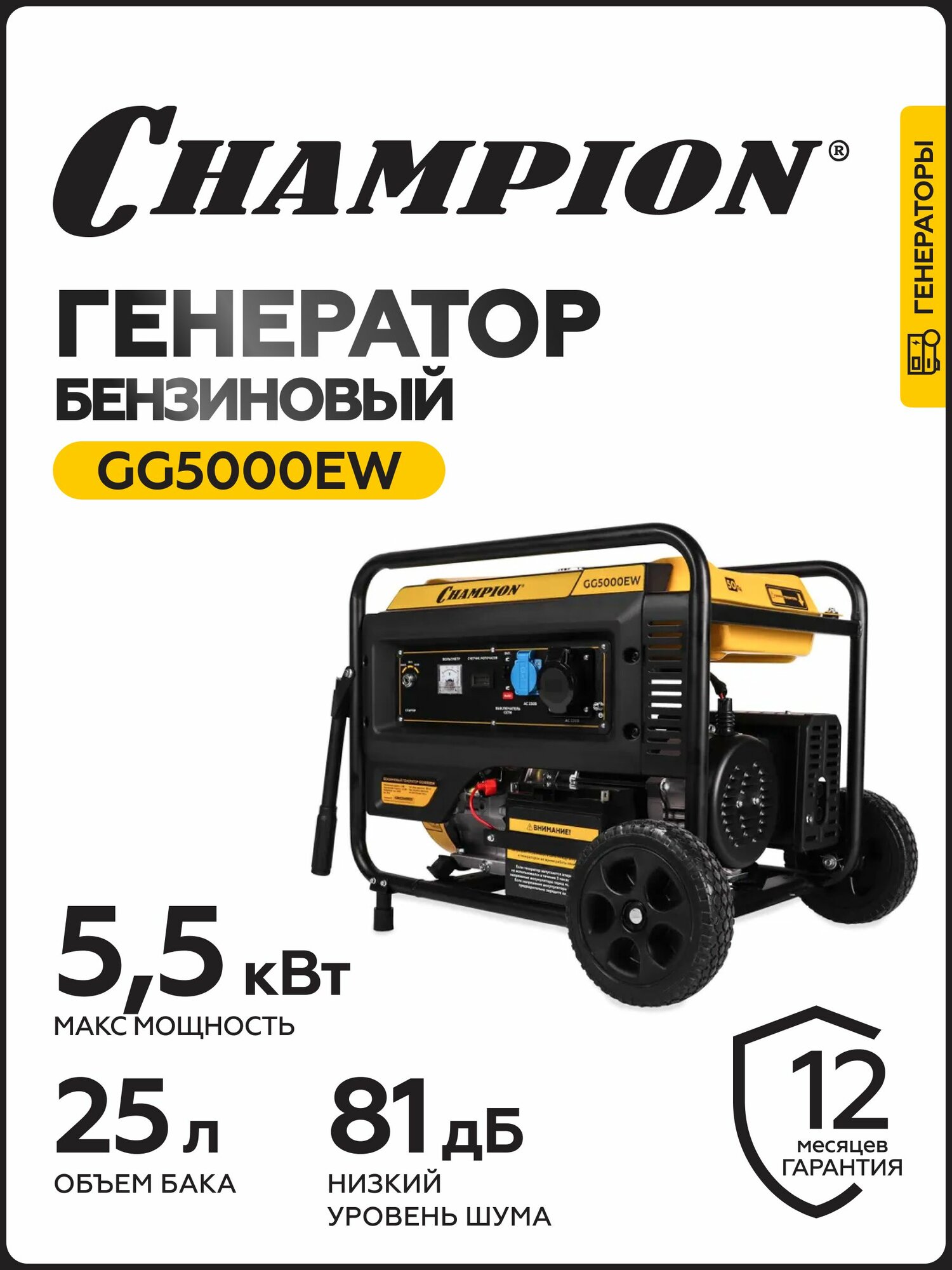 Купить Генератор бензиновый CHAMPION GG5000EW, 5/ 5,5 кВт, 230В/ 16А/ 32А, однофазный, синхронный, ручной/ электрический запуск