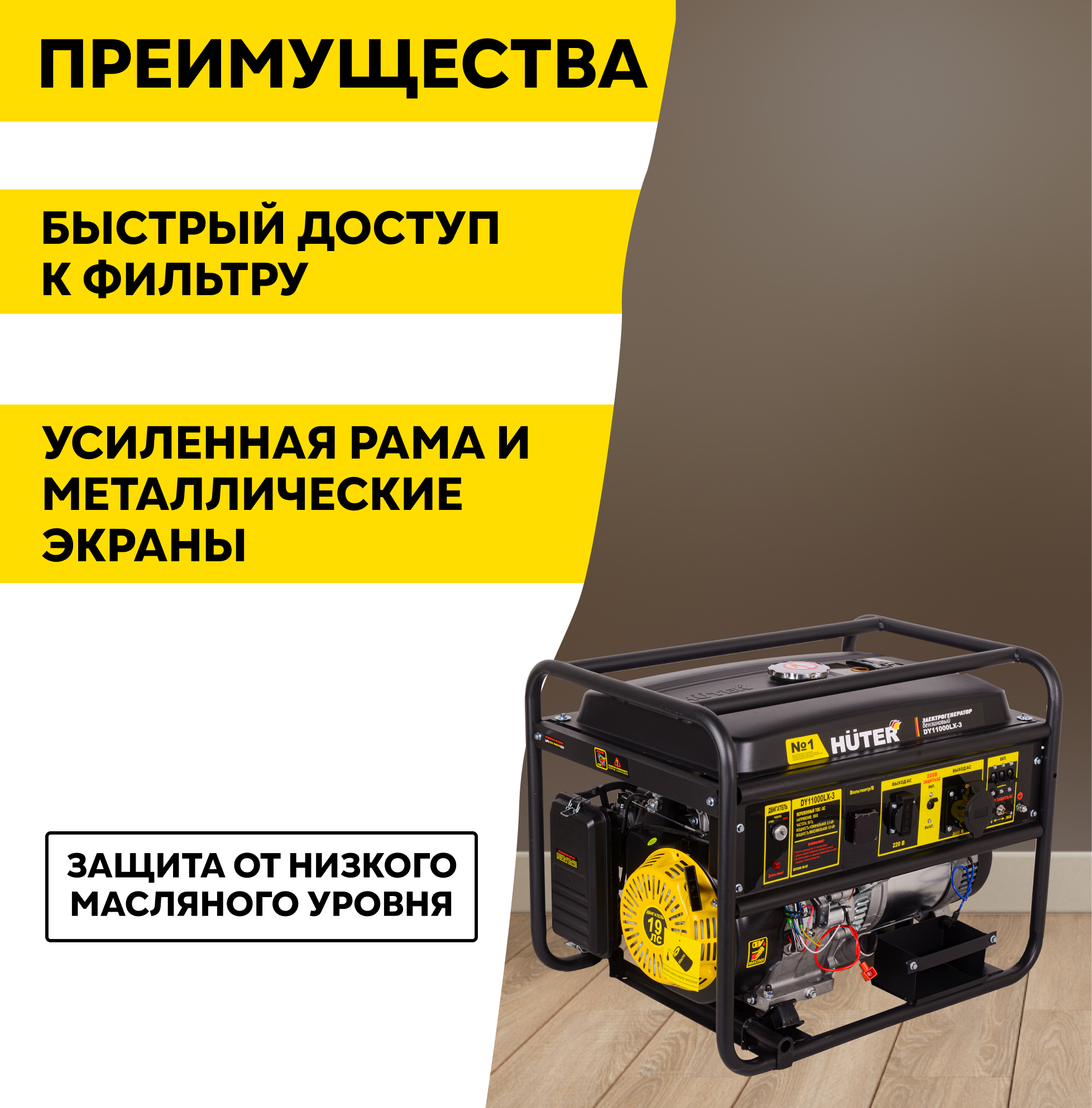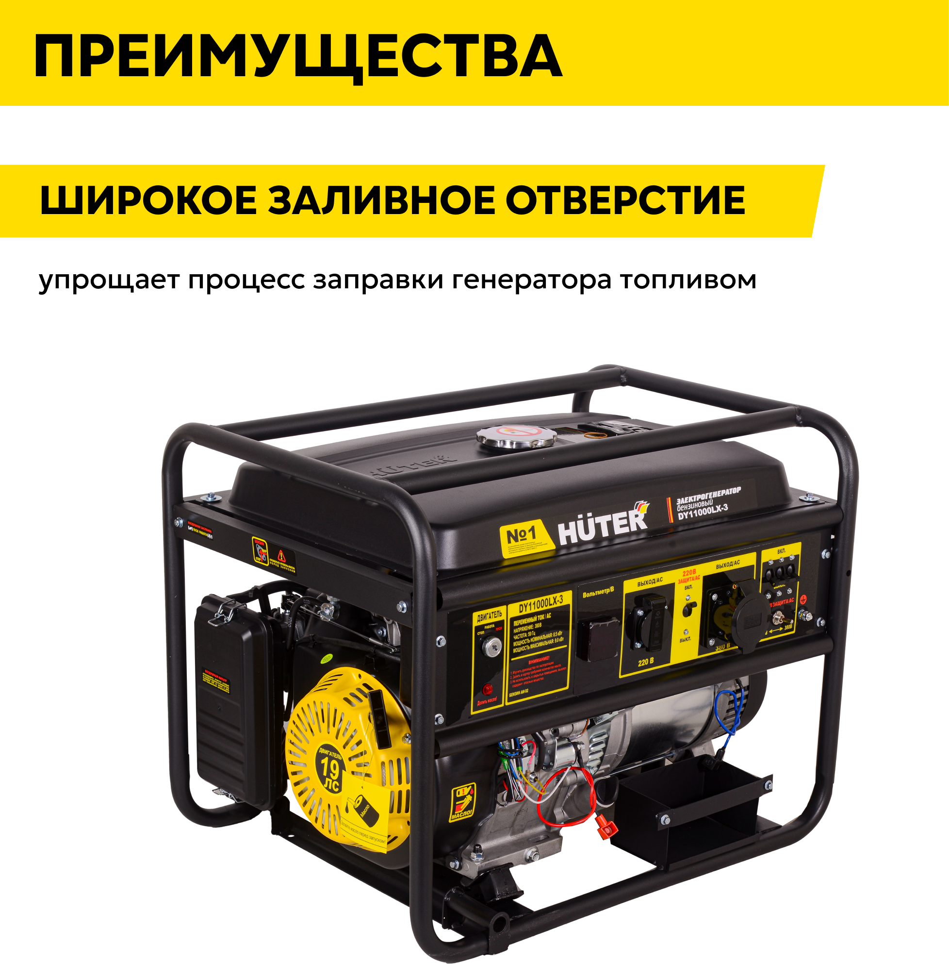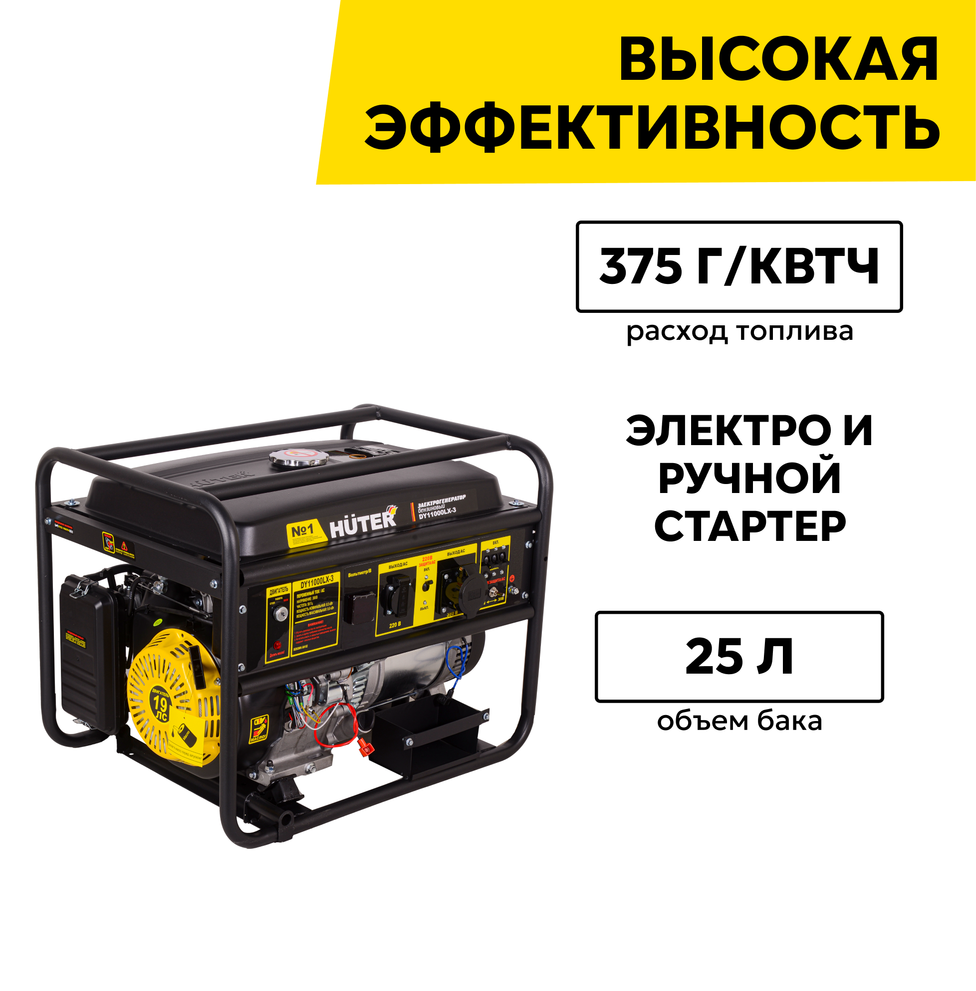 Заменил свой маломощный генератор на Huter DY9500LX-3, 8 кВт. Так же работает на бензине. Запускается без проблем. Увеличилось время, теперь могу смело работать по 8 часов без центрального электроснабжения. При весе почти 100 кг имеет небольшие габариты. Шумит в меру. Обслуживать его нетрудно, но лучше это делать регулярно, чтобы не уменьшать ресурс.
