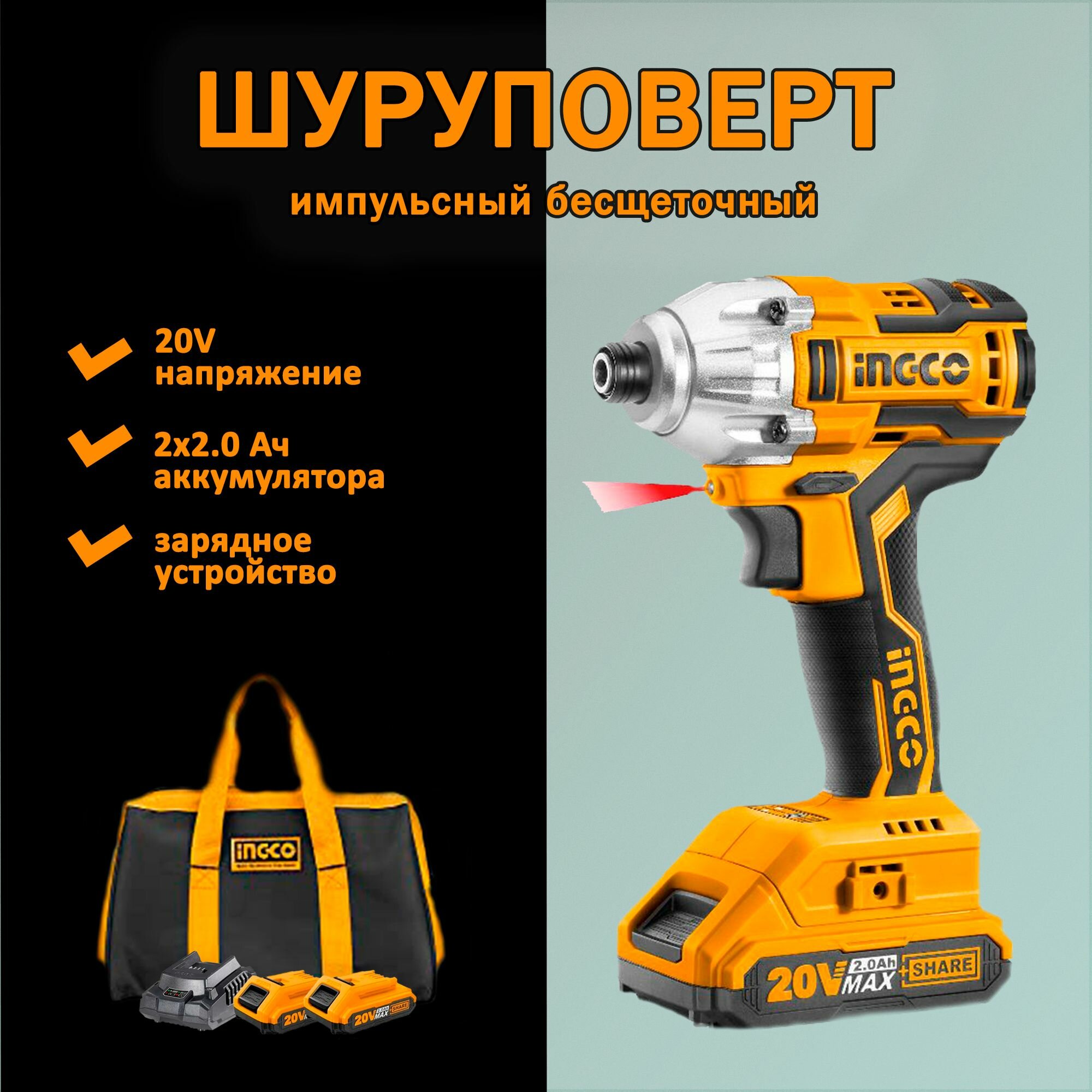 Шуруповерт INGCO CIRLI2002 импульсный бесщеточный Li-lon 20.0 В, 2 АКБ 2 Ач, 170Нм, патрон 1/4