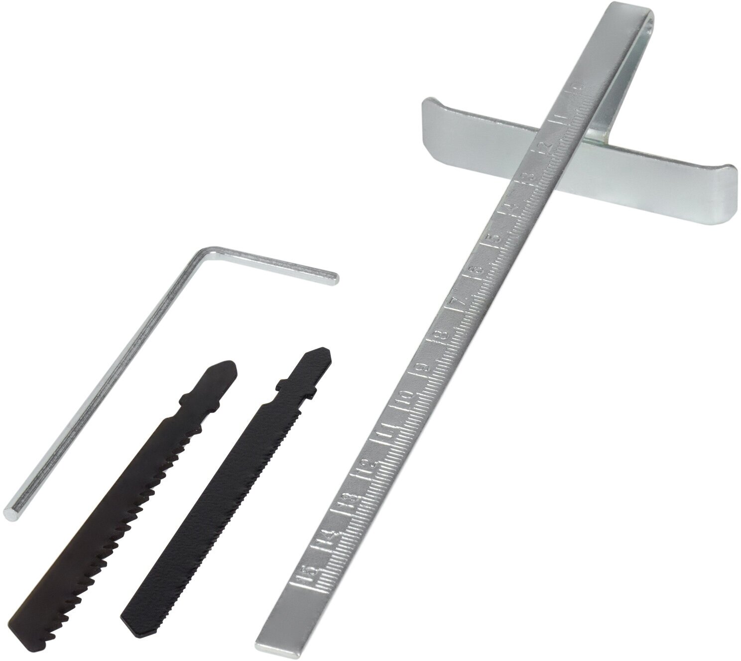 параллельный упор, пильное полотно по дереву, пильное полотно по металлу, переходник для подключения пылесоса, шестигранный ключ