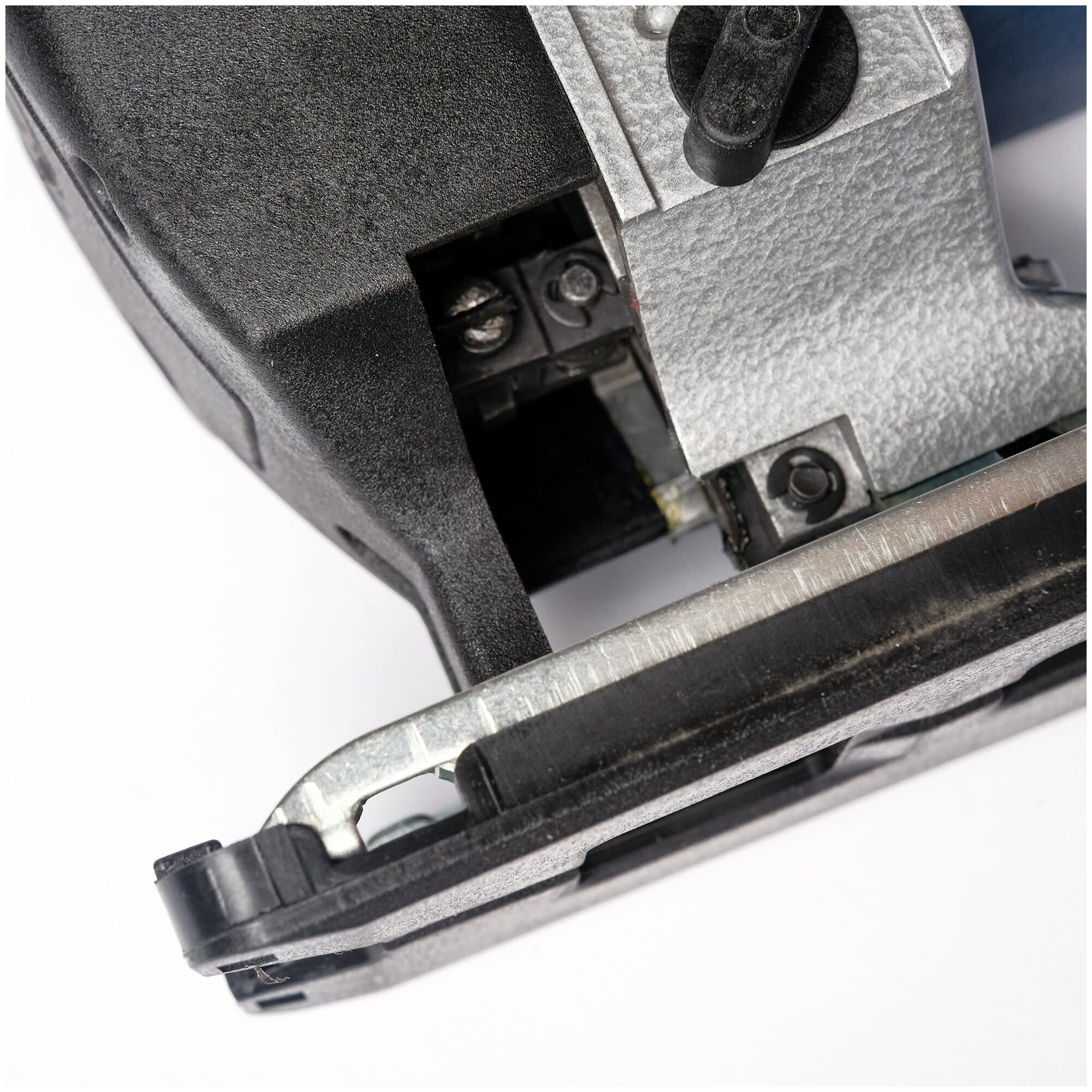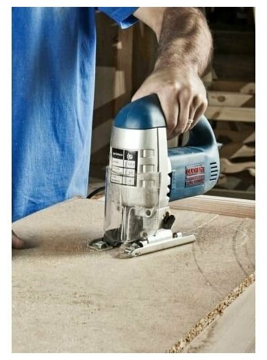 Удручают как обычно мелочи: платформа выштампована из металла недостаточной толщины, что впоследствии может привести к ее деформации при грубых работах, нет никаких выштамповок указателя под пилку, линеек тоже нет, приходится смотреть на пилку (если важна точность), а сдув опилок идет прямо в лицо, еще платформа царапает поверхность. Но все равно плюсы и цена перекрывают минусы, не подвел. Еще пилки служат дольше, чем на боше. |