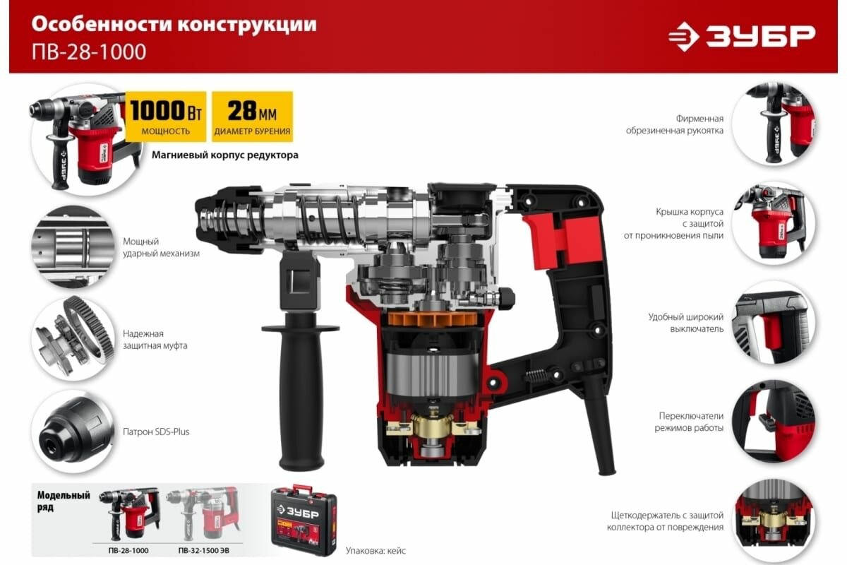 СохранитьЗУБР 1000 Вт, 28 мм, Перфоратор электрический SDS Plus ПВ-28-1000 интересное: