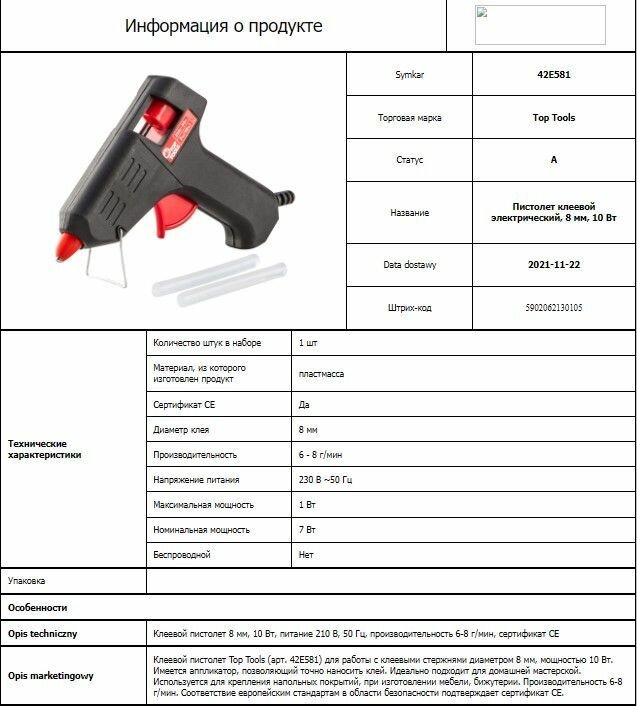 Ниже Вы можете прочитать отзывы на Пистолет клеевой электрический, 8 мм, 10 Вт Top Tools 42E581, ознакомится с подробными характеристиками, посмотреть интересные обзоры и фотографии на Пистолет клеевой электрический, 8 мм, 10 Вт Top Tools 42E581.