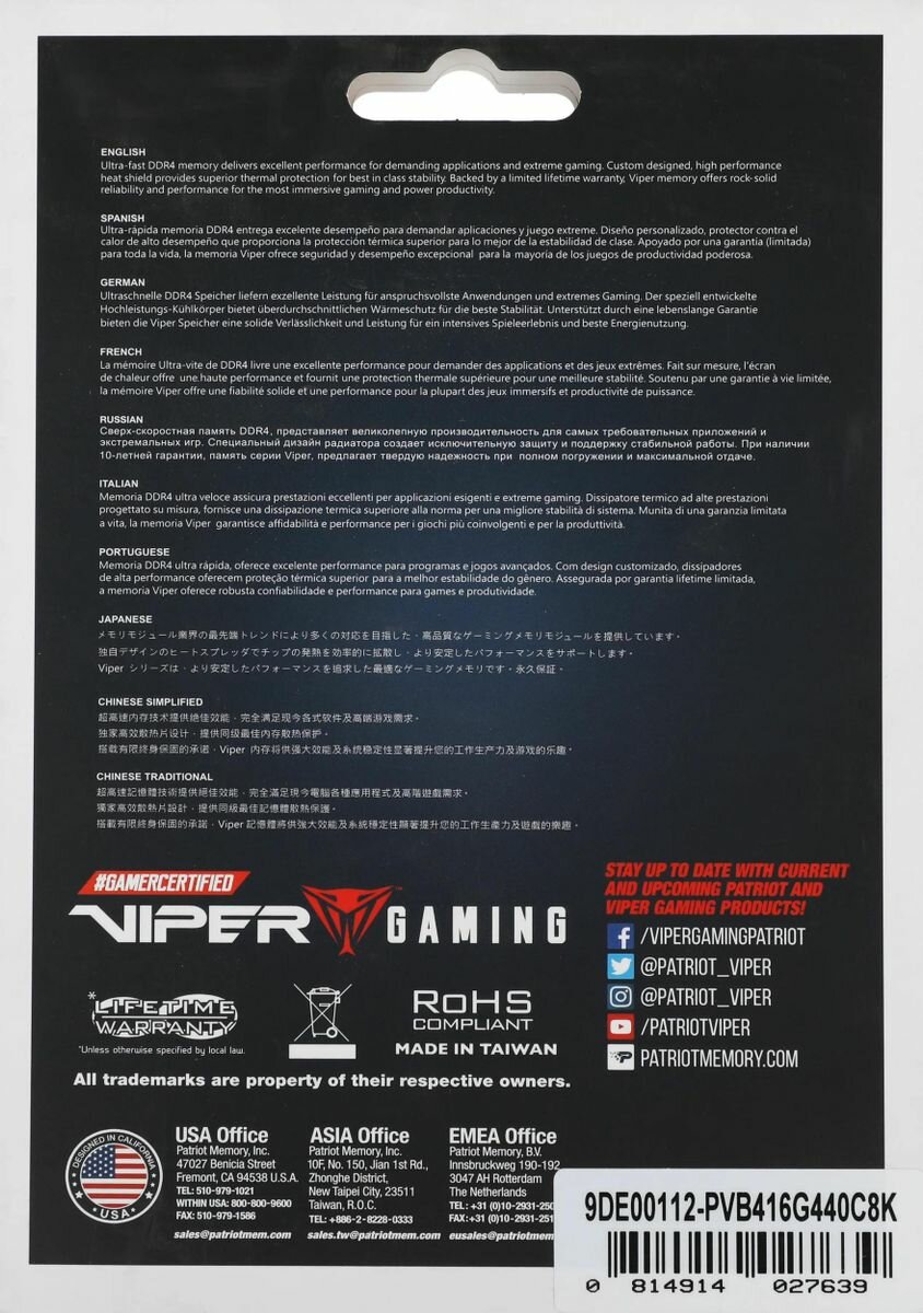 Patriot DDR4 16Gb (2x8Gb) 4400MHz pc-35200 Viper Blackout (pvb416g440c8k) Pvb416g440c8k .