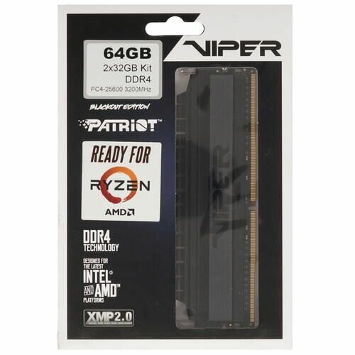 Оперативная память 64GB Patriot Viper Blackout PVB464G320C6K (2x32Gb KIT) DDR4, 3200 MHz, 25600 Мб/с, CL16, 1.35 В (DIMM)