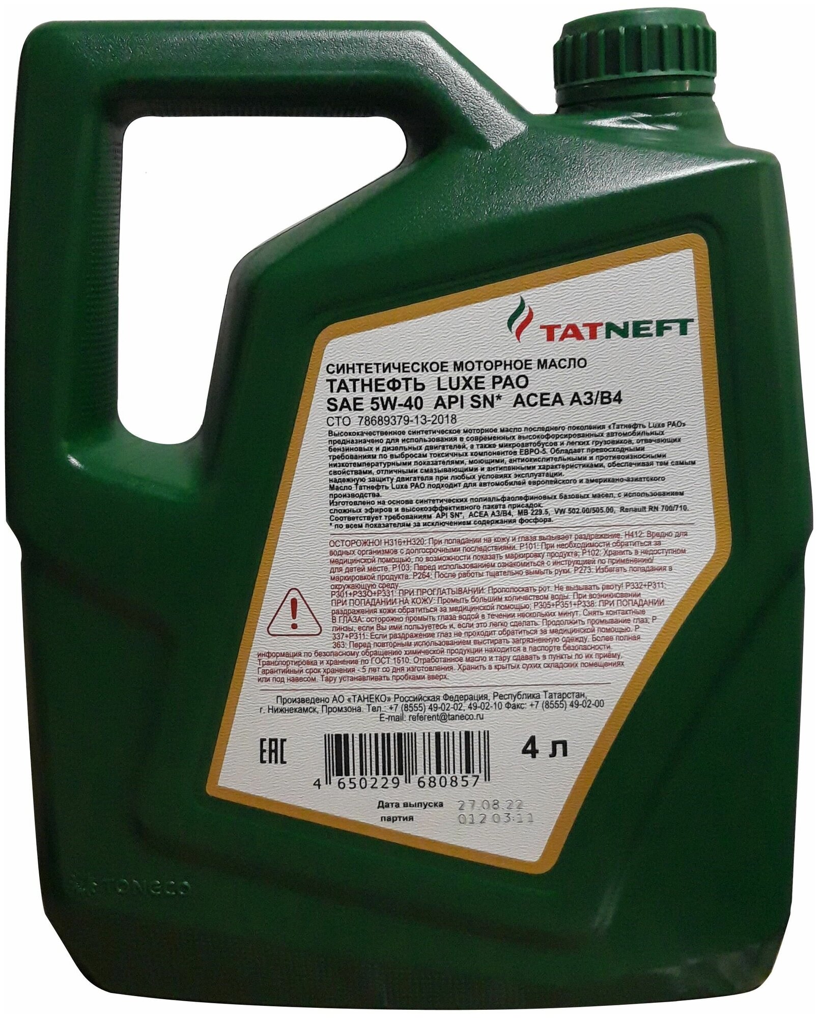 Синтетическое моторное масло Татнефть LUXE PAO 5W-40, 4 л, 3.9 кг, 1 шт