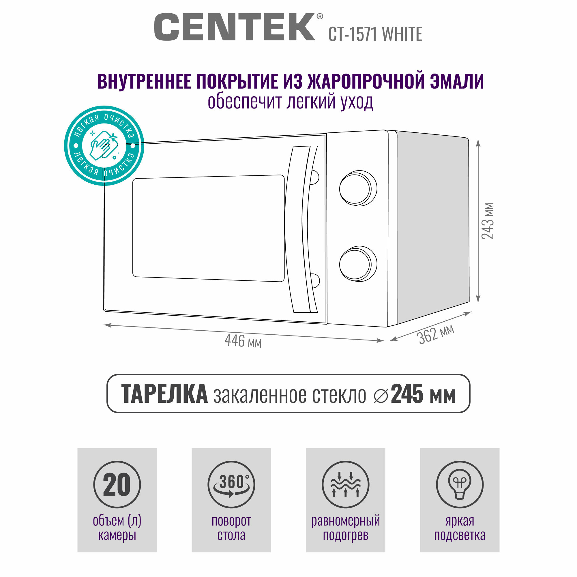 Микроволновая печь Centek CT-1571, 700 Вт, 20л, белый