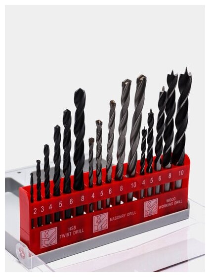 | Типоразмеры | Сверло по бетону: 4, 5, 6, 8, 10 мм; Сверло по металлу: 2, 3, 4, 5, 6, 8 мм Сверло по дереву: 4 , 5, 6, 8, 10 мм |