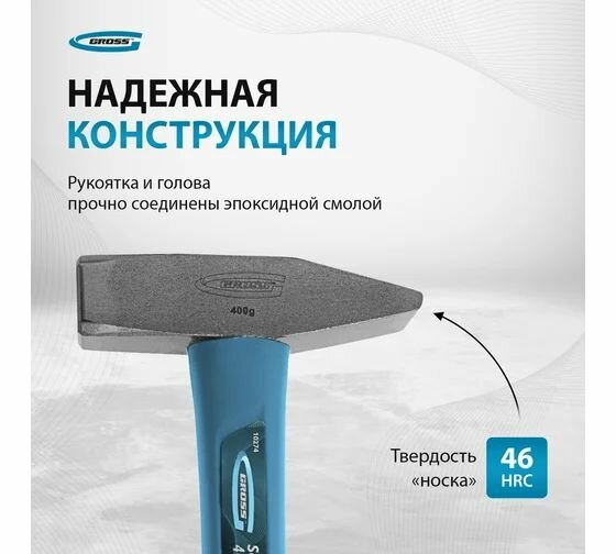 Молоток слесарный, 600 г, квадратный боек, фибергласовая обрезиненная рукоятка Gross, 10277