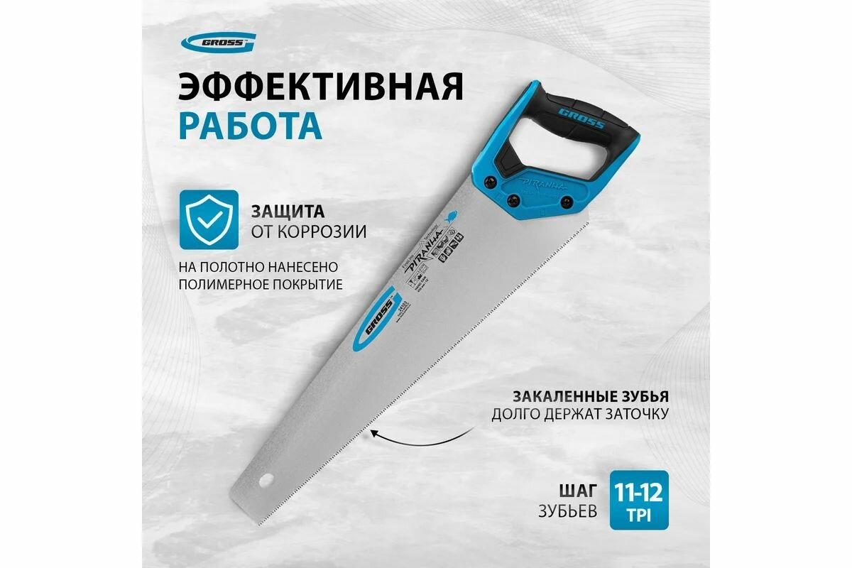 Ножовка по дереву Gross Piranha, 450 мм, 11-12 TPI, зуб-3D, каленый зуб, двухкомпонентная рукоятка