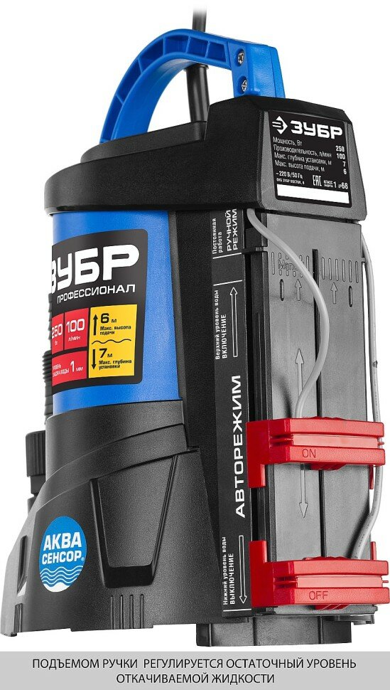 Дренажный насос ЗУБР с минимальным уровнем откачки до 1мм, АкваСенсор, 250 Вт