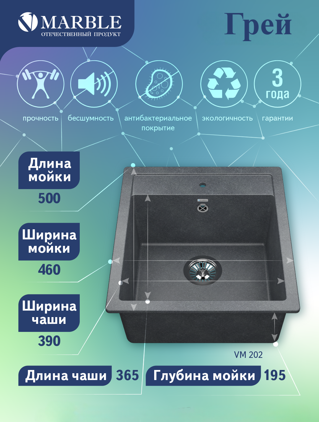 Купить Кухонная мойка MARBLE VM202 грей искусственный мрамор, квадрат