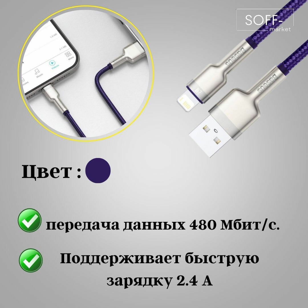 Кабель для зарядки и передачи данных Baseus Cafule Series Metal, USB to Lightning, 2.4A, 1 м, Фиолетовый