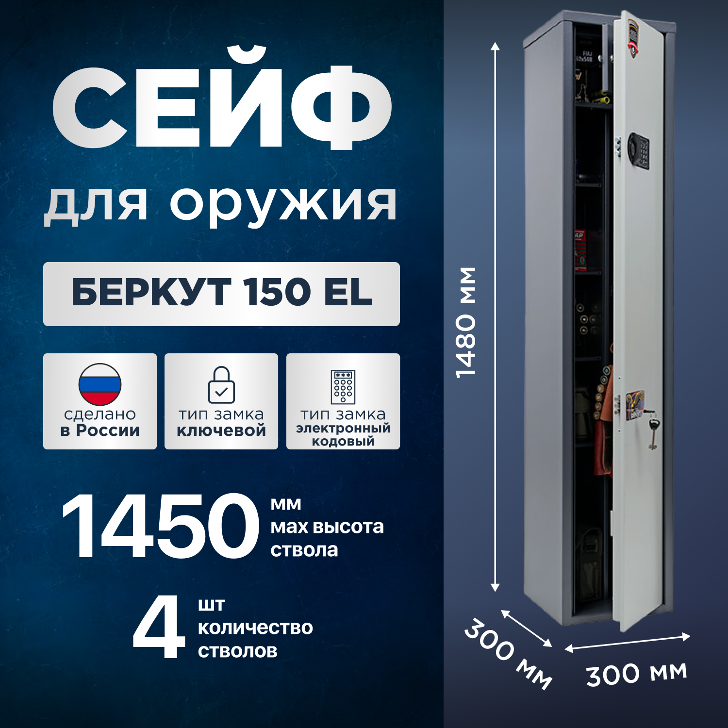Купить Сейф оружейный на 4 ствола AIKO Беркут 150 EL, с электронным кодовым замком, высота ствола до 1450 мм, 1480x300x300мм