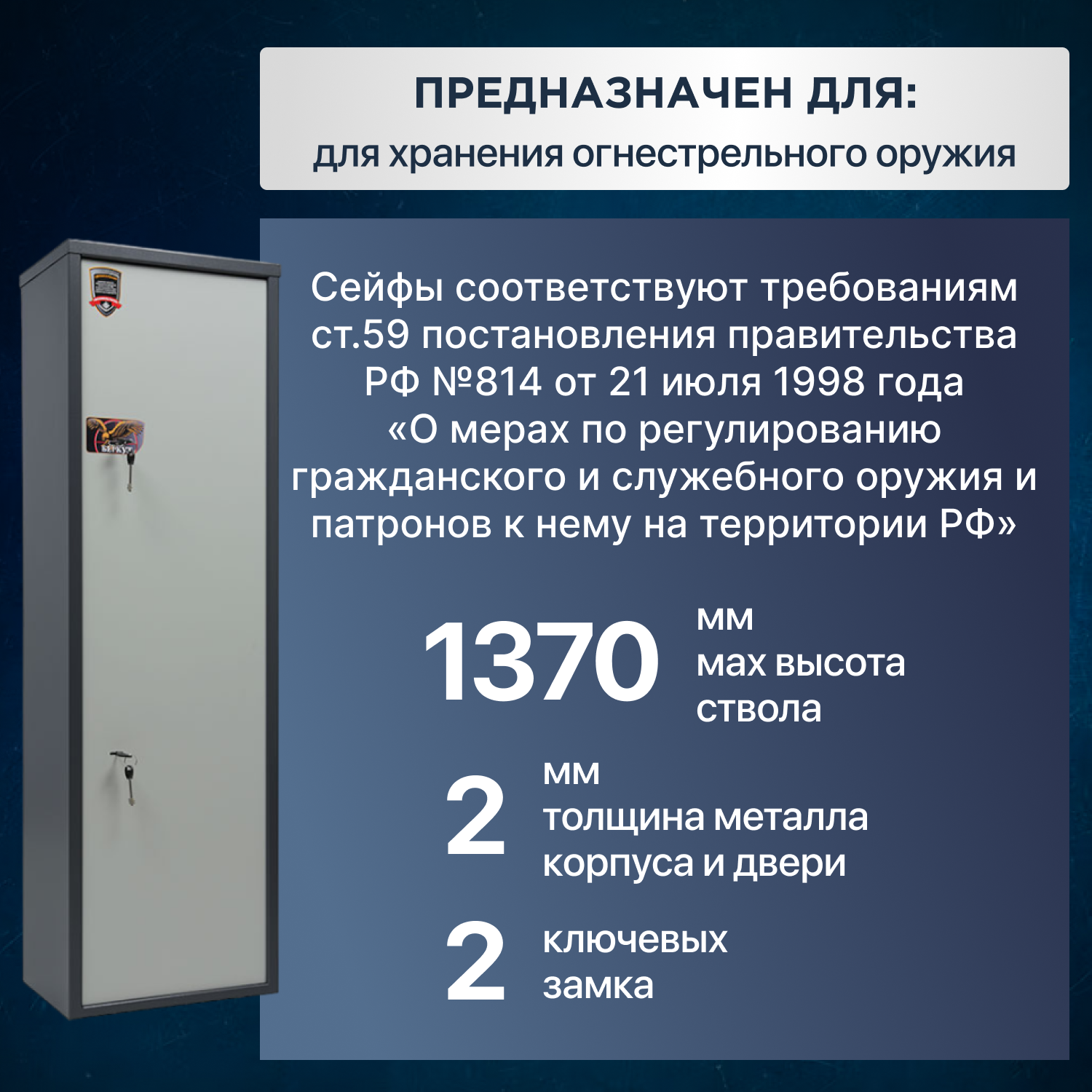 Оружейный сейф на 5 стволов AIKO БЕРКУТ 146, металл 2мм, высота ствола до 1370 мм, размеры: 1400х620х280мм