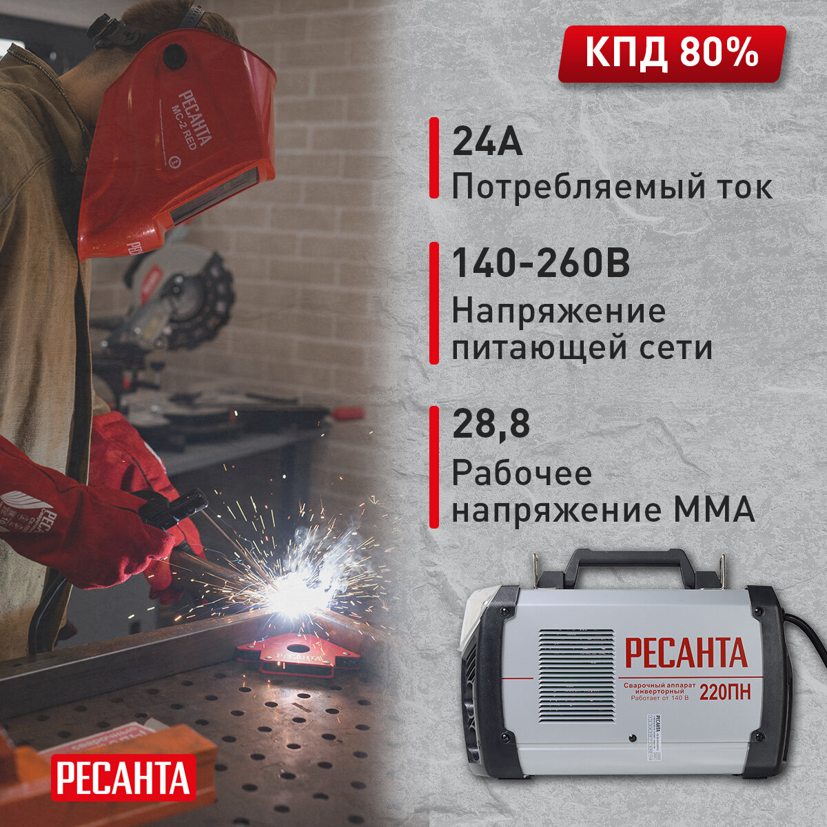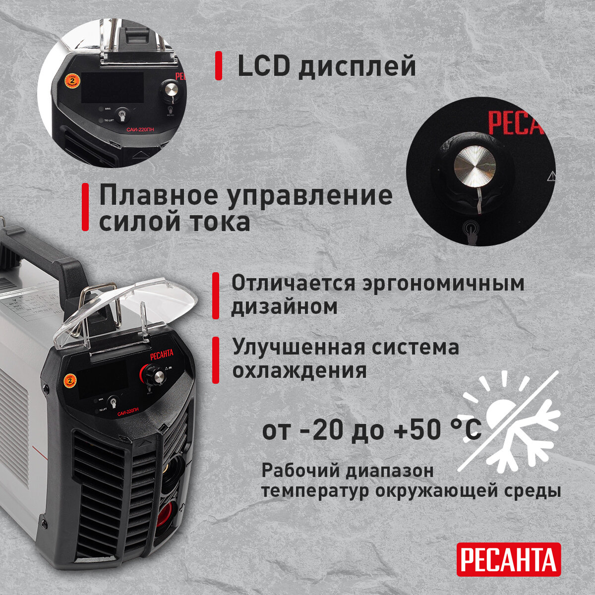 Сварочный аппарат инверторный САИ-220ПН РЕСАНТА для работы при пониженном напряжения от 140В / рабочий ток 10-220А