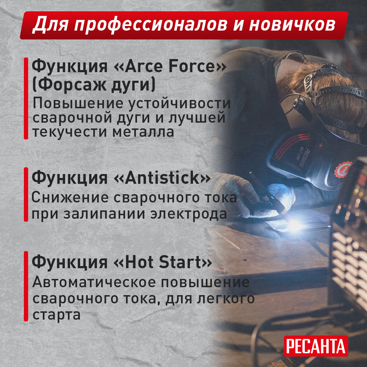 | Дополнительные функции | функция VRD / антиприлипание / горячий старт / форсаж дуги |