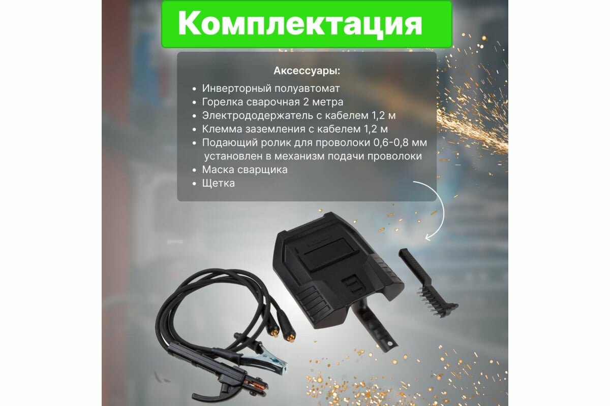 | Комплектация | полуавтомат сварочный, горелка сварочная MIG - 3 метра, клемма заземления - 1,2 метра, электрододержатель MMA - 1,2 метра, щиток сварщика, щетка для удаления шлака, руководство по эксплуатации |