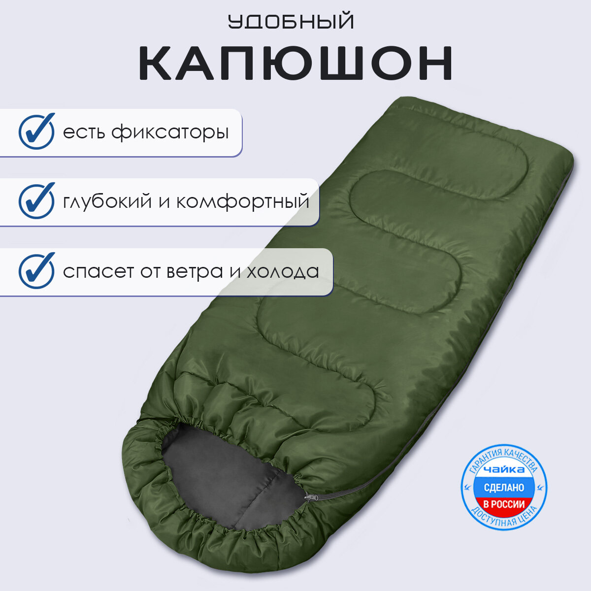 Спальный мешок Чайка "СП3", туристический, с капюшоном, чехол в комплекте, цвет хаки, 235х75 см