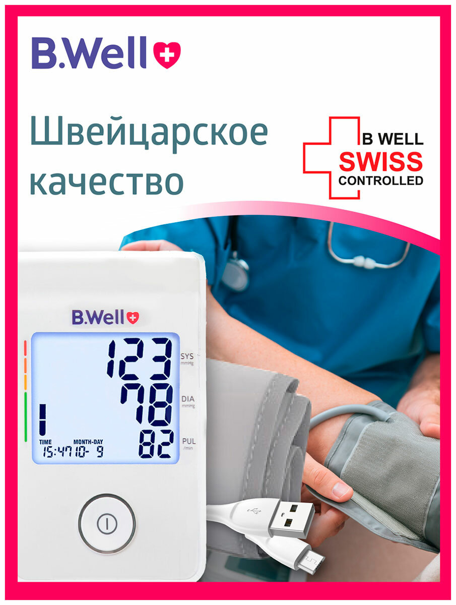 Тонометр B.Well MED-53 + адаптер + универсальная манжета 22-42см, Micro USB разъем питания, подсветка дисплея, бережное измерение Intellect Active