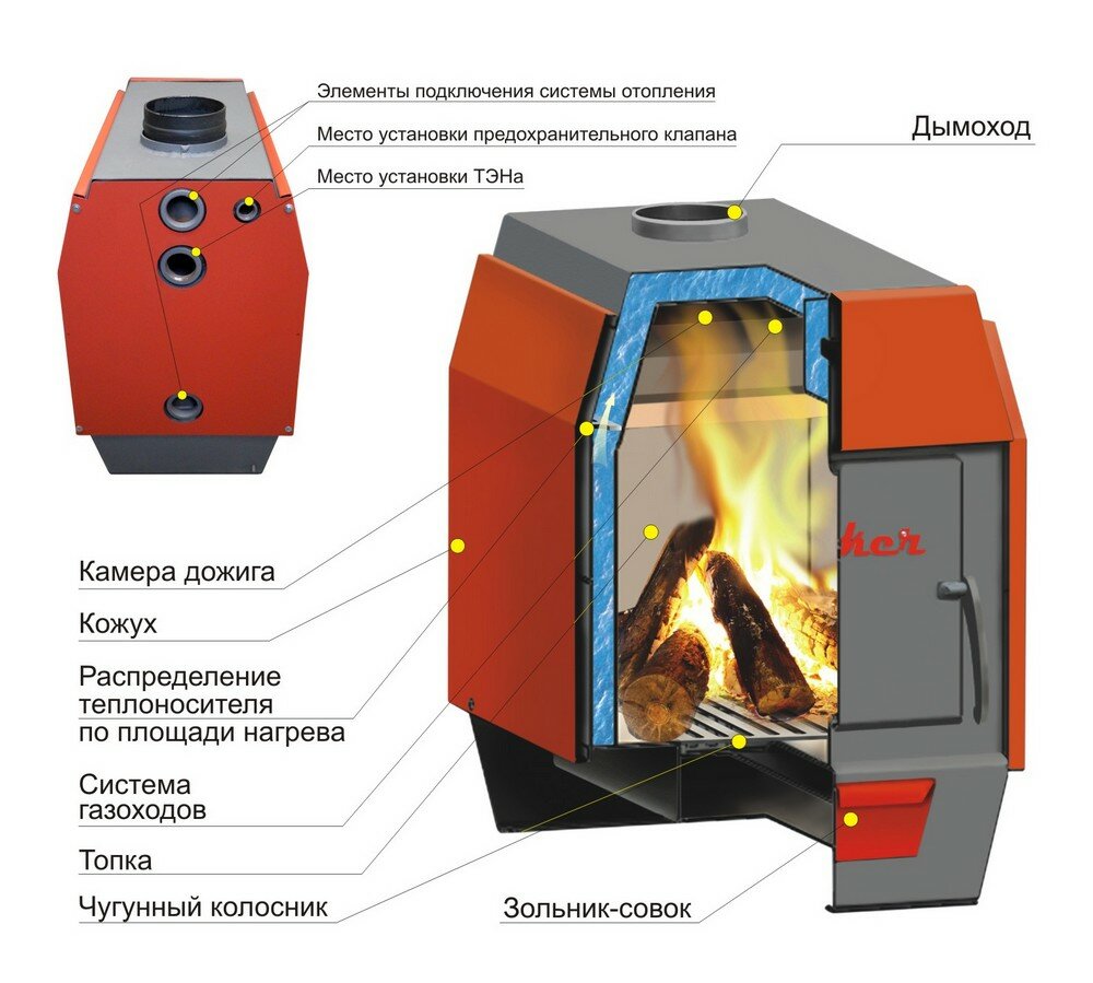 | Плюсы: | Компактный с большой по глубине топкой и встроенным теплообменником |
