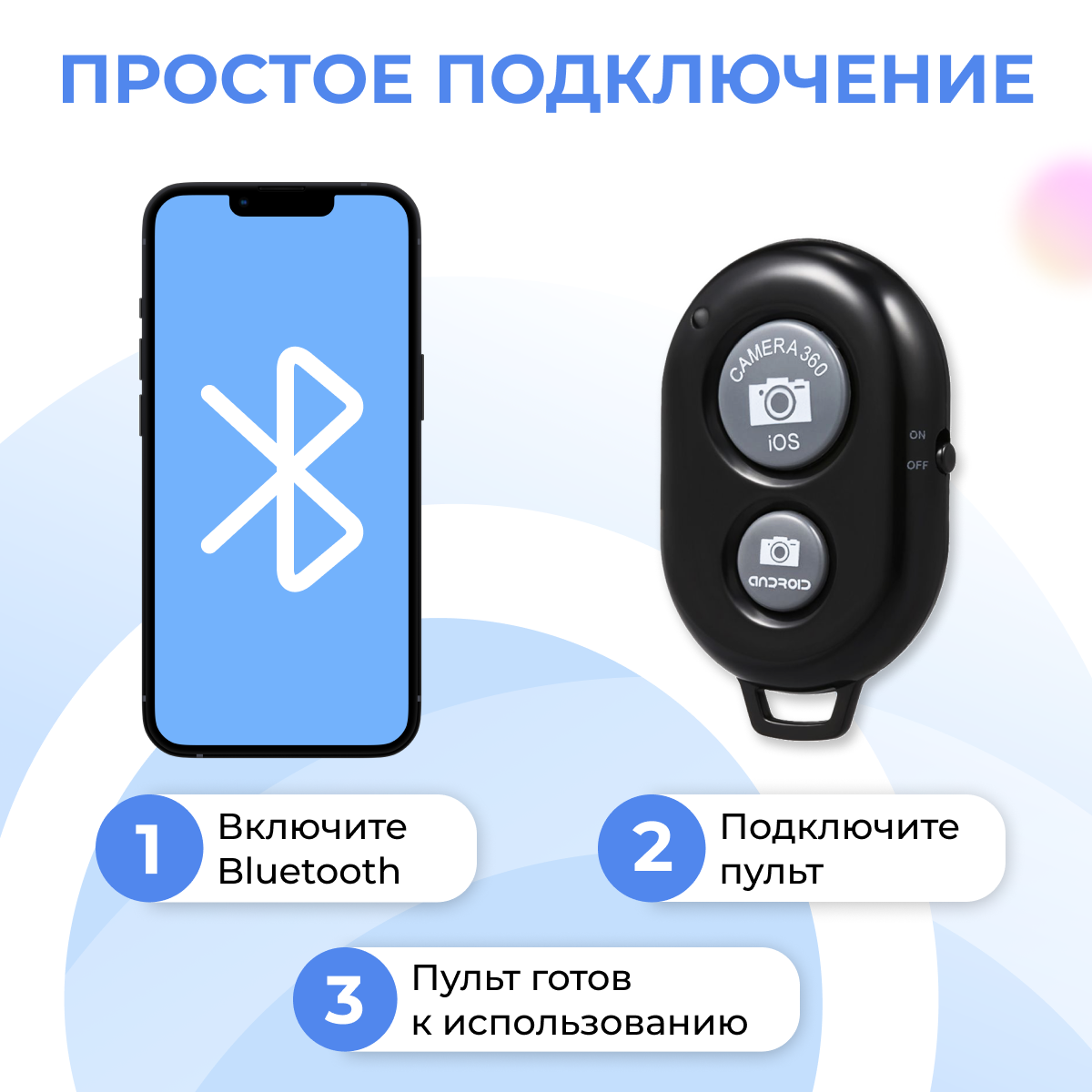 | Дополнительная информация | IOS, Android Принцип работы устройства очень прост. Достаточно синхронизировать пульт со смартфоном и установить его на необходимом расстоянии. Выбирайте подходящий ракурс и получайте красивые фото. Незаменимый аксессуар питается от батарейки CR2032 и не требует установки сторонних приложений. Достаточно стандартного приложения смартфона. Пульт совместим с Android и iOS. Для синхронизации включите питание на кнопке. После перехода в режим обнаружения, когда загорится синий индикатор, включите Bluetooth и перейдите к списку устройств. Повторное подключение происходит еще быстрее, достаточно активировать Bluetooth и кнопку и автоматически произойдет подключение. |