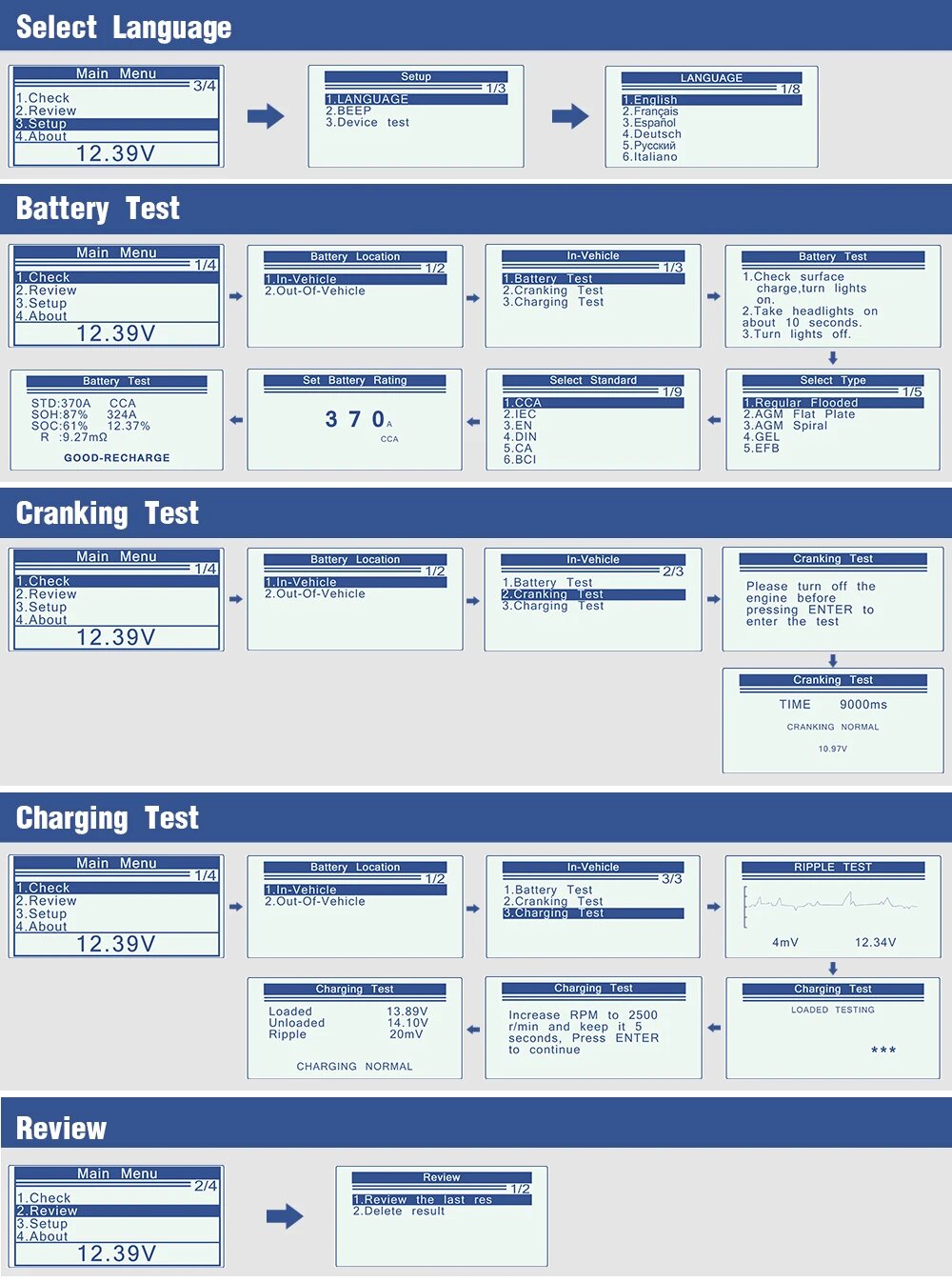 | Дополнительная информация | Дисплей LCD 2.4" Для вольтажа 12v Русский язык есть Функции Системное напряжение 12 вольт и испытание на напряжение в форме волны, Результат теста хорошая, перезарядка или заменить, Емкость холодных каналов AMPS (CCA), DIN, EN и IEC информация относительно рейтинга батареи, Значение внутреннего сопротивления (Mω) и жизнь в процентах (%), Система и зарядная система, Запись и повторное воспроизведение данных батареи, Тест на аккумулятор, тест на закате, тест зарядки и другие дополнительные функции, Основные Стандарты Батареи CA, CCA, BCL, MCA, JIS, SAE, EN, GB, DIN И IEC Поддерживаются |