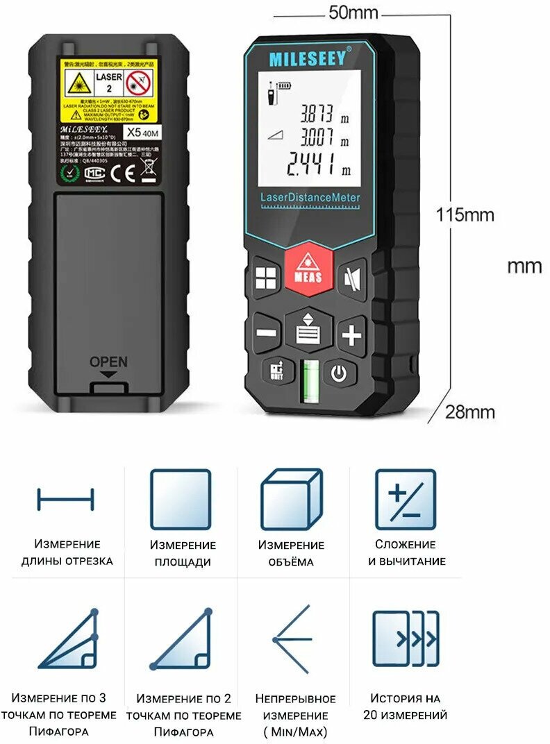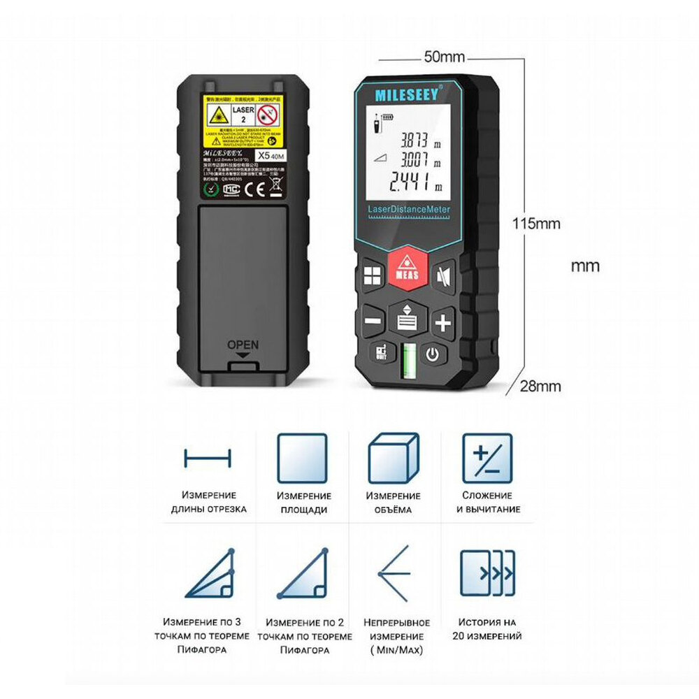 Лазерный измеритель расстояния MILESEEY X5, 40 м, 60 м, 80 м, 100 м