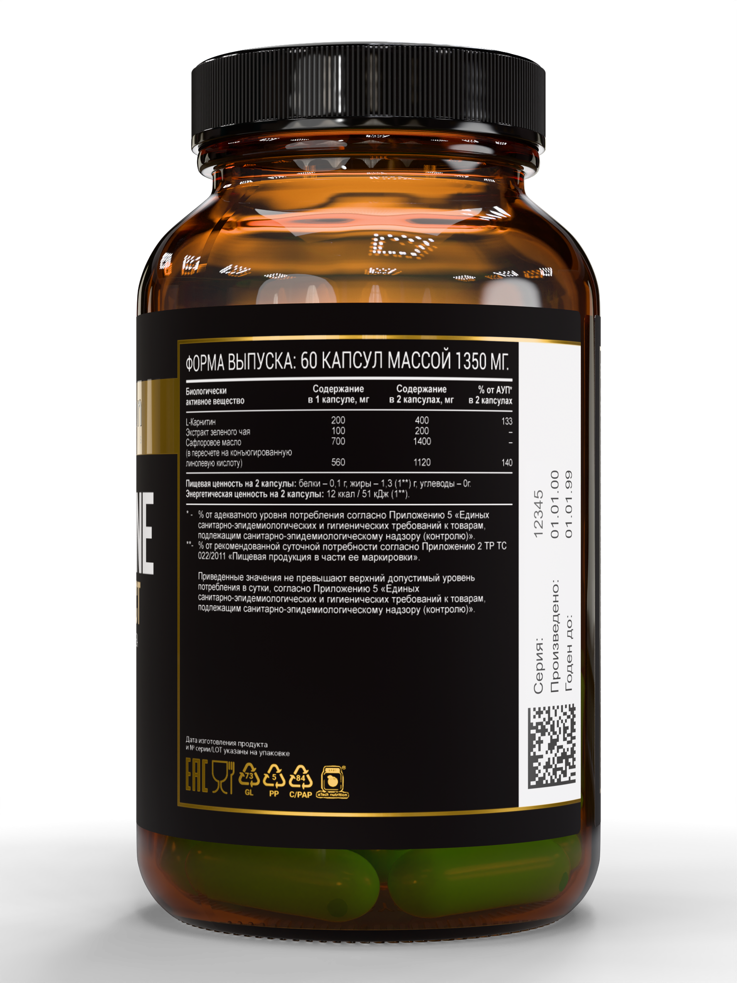 | Дополнительная информация | состав: масло сафлоровое нерафинированное, масло оливковое нерафинированное, аминокислота l-карнитин, экстракт зелёного чая (60%), моностеарат глицерина (эмульгатор), оболочка (желатин, агент влагоудерживающий глицерин, вода очищенная).; рекомендации по применению: Рекомендации: Для коррекции фигуры принимайте по 2 капсулы 2 раза в день, первые 2 капсулы после пробуждения и 2 капсулы во второй половине дня либо за 30 минут то физической активности, но не позднее 6 часов до сна. Капсулы принимаются натощак (за 30 минут до приёма пищи). Для улучшения обмена веществ рекомендации по применению: взрослым по 2 капсулы 2 раза в день во время еды. Продолжительность приема - 1 месяц. |