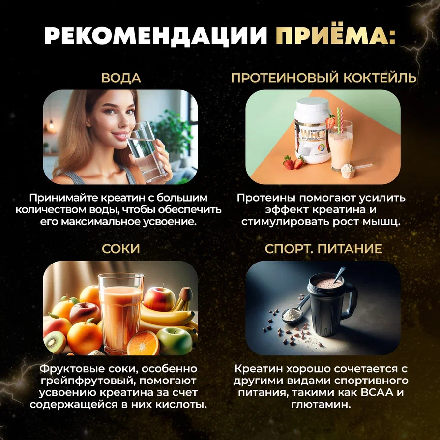 рекомендации по применению: для достижения наилучшего результата принимайте продукт по следующей схеме: 10 дней - 3 раза в день по 1 порции, желательно после еды, или с углеводами; последующие 20 дней по 2 порции в день. После этого желательно сделать перерыв 2-4 недели.; состав: креатин моногидрат , твердая капсула