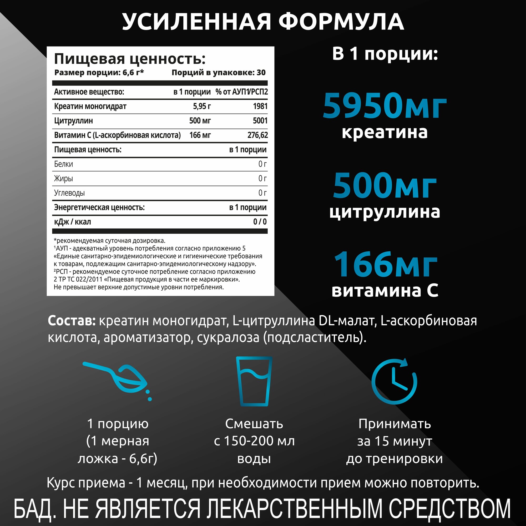 Креатин моногидрат порошок, Вкус Энергетик, 30 порций, спортивное питание для набора массы тела