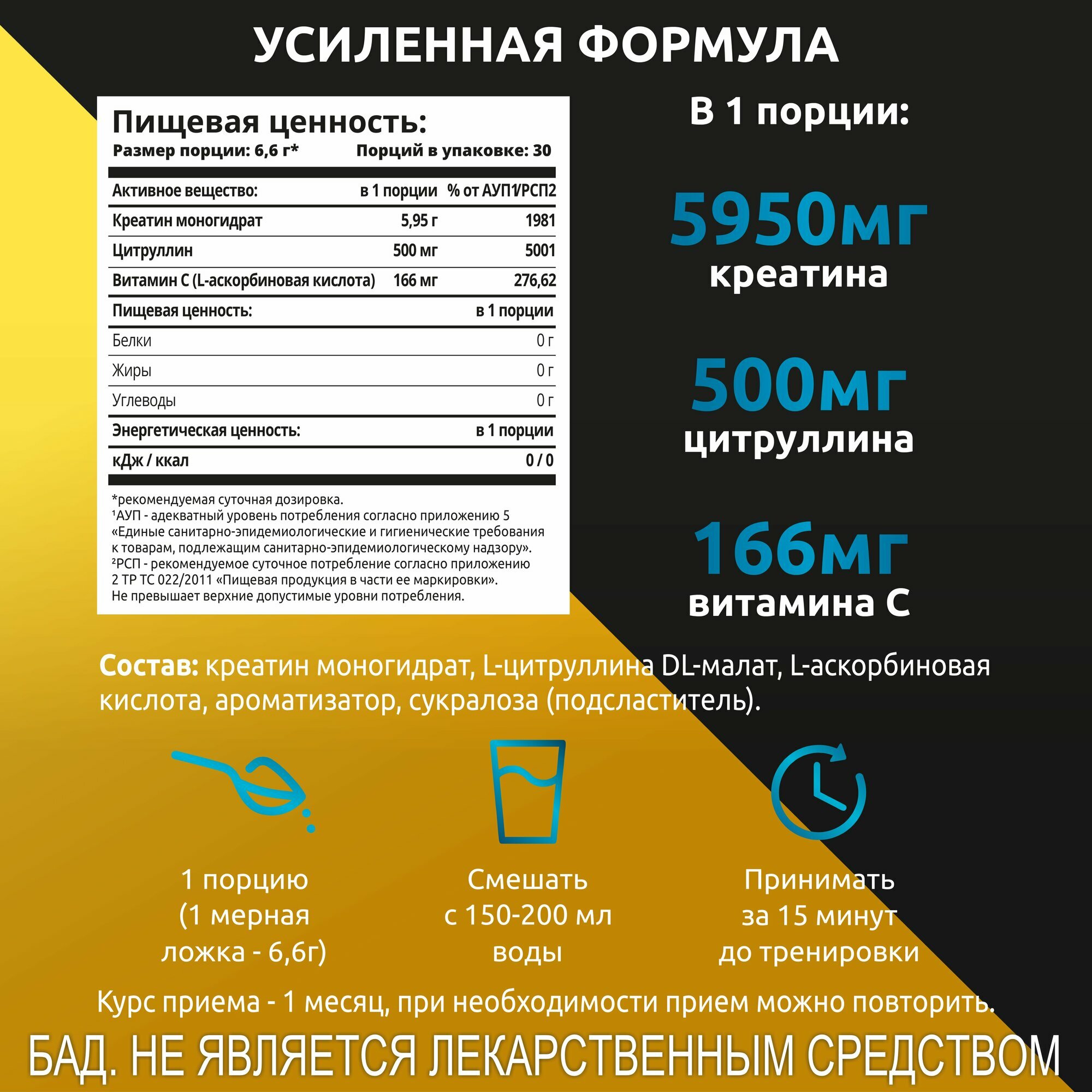 Креатин Моногидрат порошок + L-цитруллин, Апельсин-Лимон, 200 г, 30 порций, спортивное питание для набора массы тела