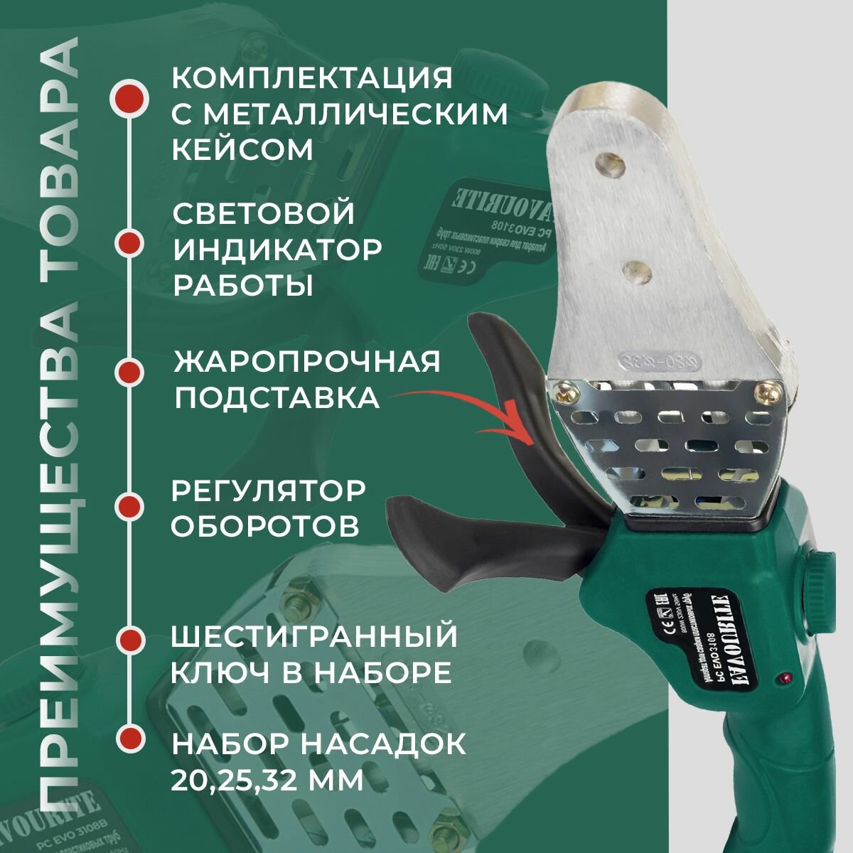 Аппарат для сварки пластиковых ПВХ труб / паяльник для полипропиленовых труб FAVOURITE PC EVO 3108 В, 800 Вт, регулятор температуры, 3 насадки