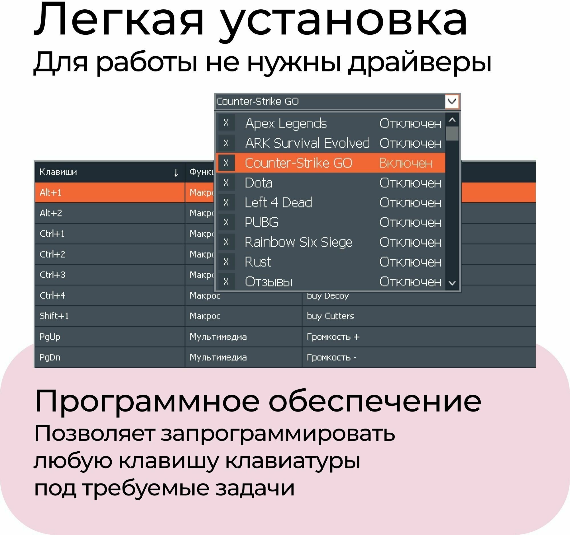 | Минусы: | Одновременно нажимаются не более 3х клавиш, остальные нажатия не срабатывают. |