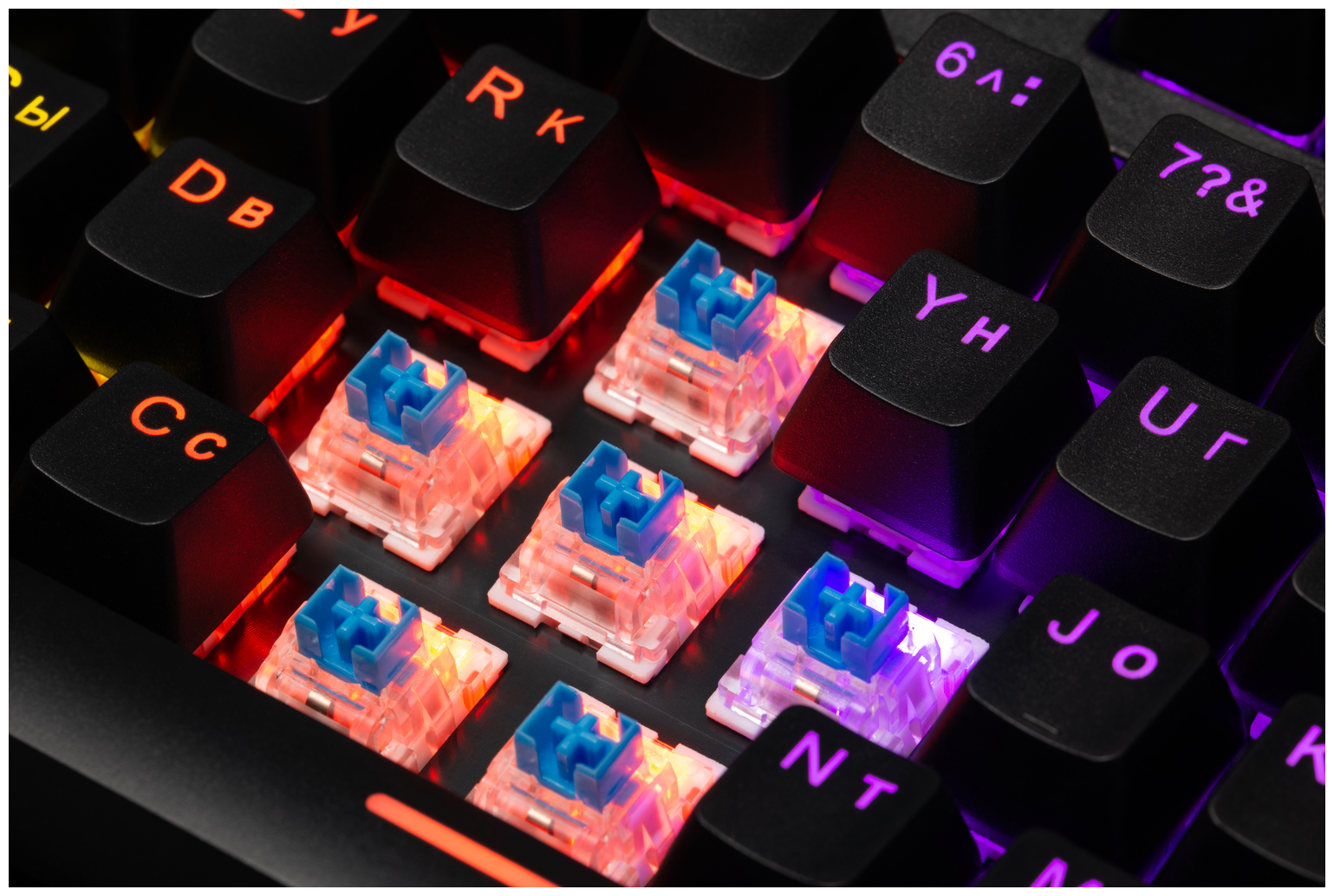 | Дополнительная информация | ; радужная подсветка, 9 режимов, 3-уровневая регулируемая яркость, возможность выключения подсветки; повышенная износостойкость; аппаратная блокировка клавиши WIN во время игры, распознает одновременное нажатие 26 клавиш, комбинации клавиш ""Fn+Ins"", горячие клавиши для быстрого доступа к офисным, мультимедийным и интернет приложениям; звонкий звук/щелчок переключателей; технология Double injection |