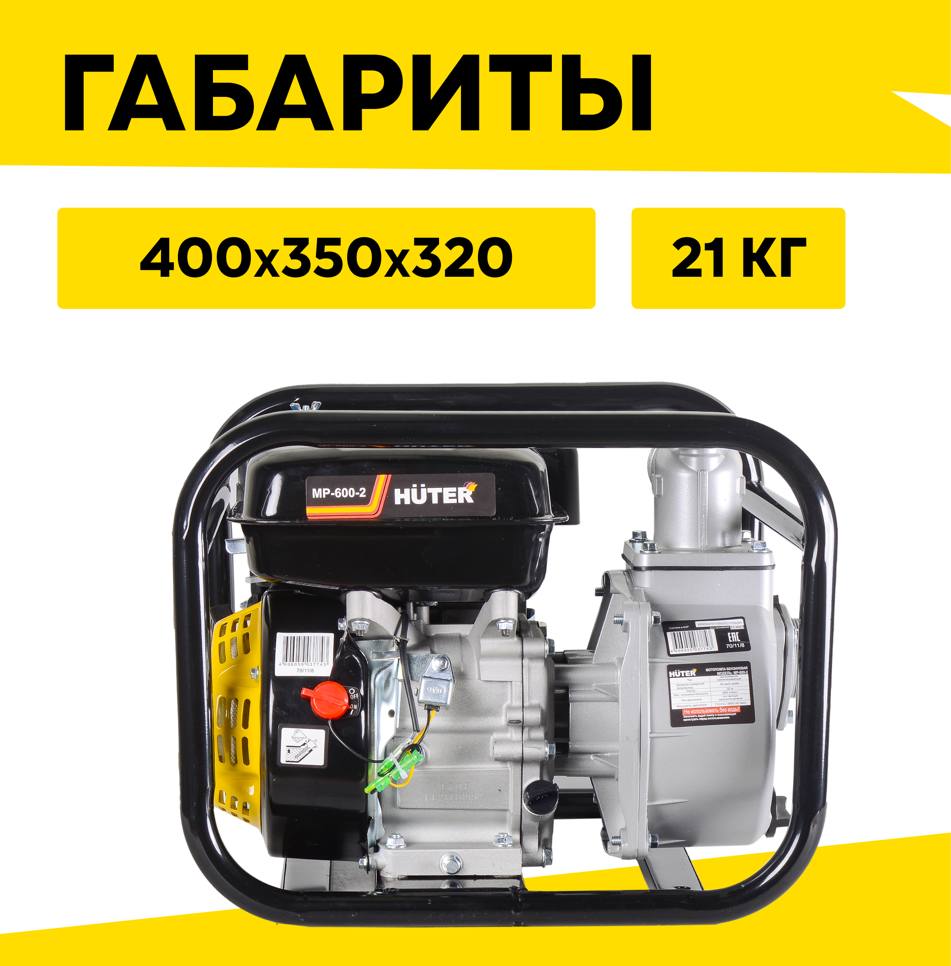 Мотопомпа Huter MP-600-2, центробежная, самовсасывающая, для чистой воды, 7 л. с, 3800 об/мин, 50/2 мм/дюйм, 600 л/мин интересное:
