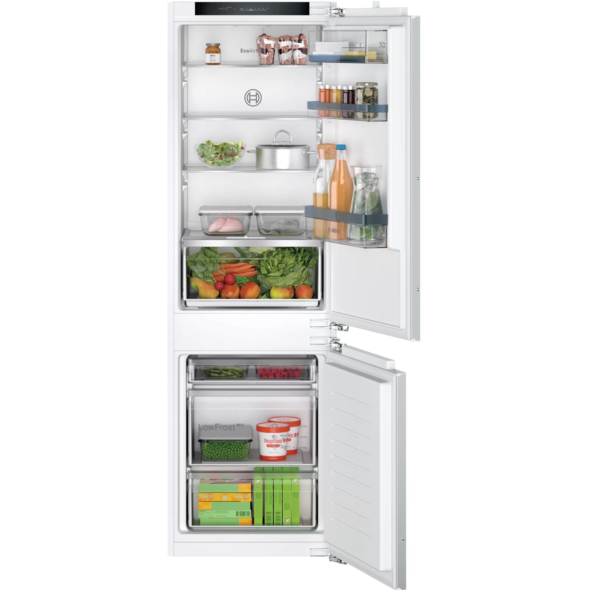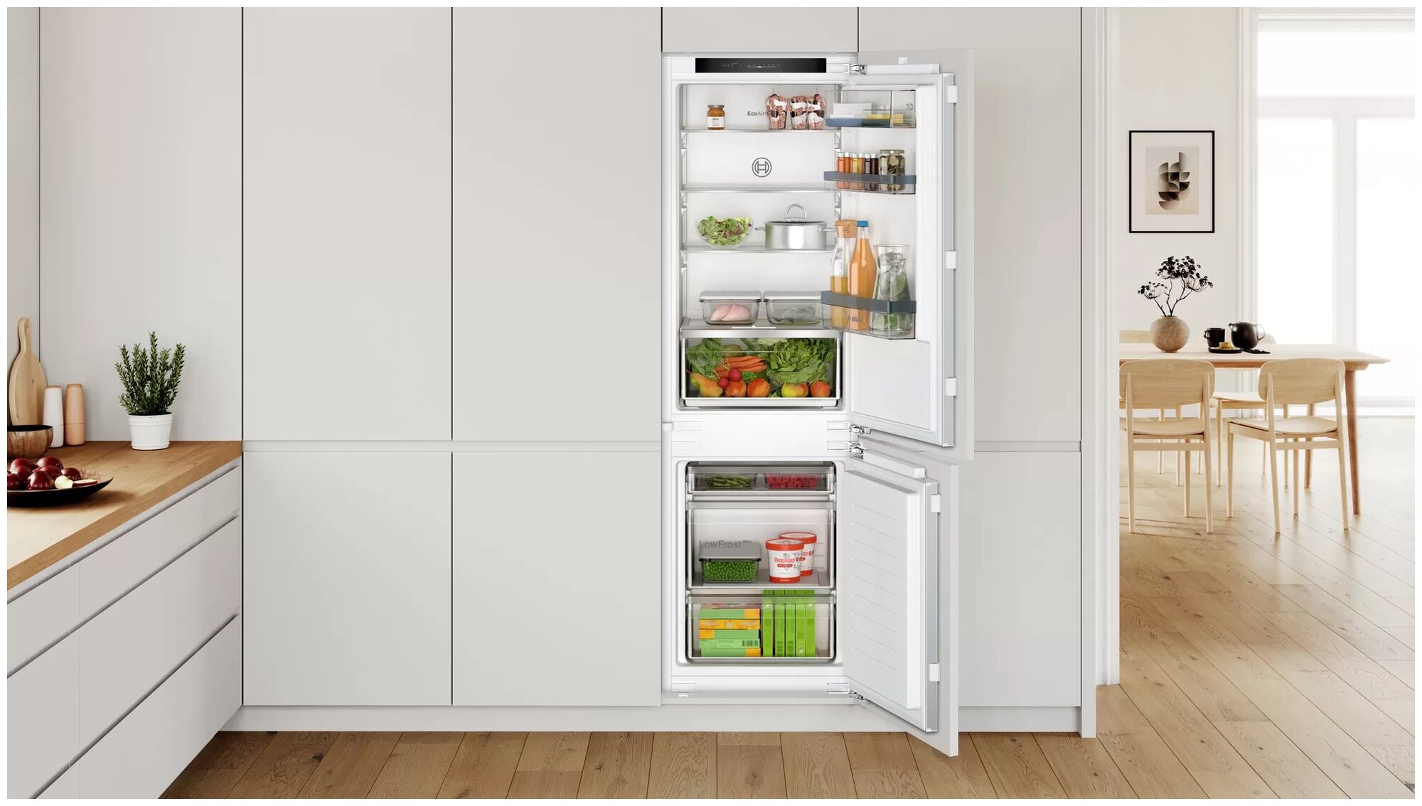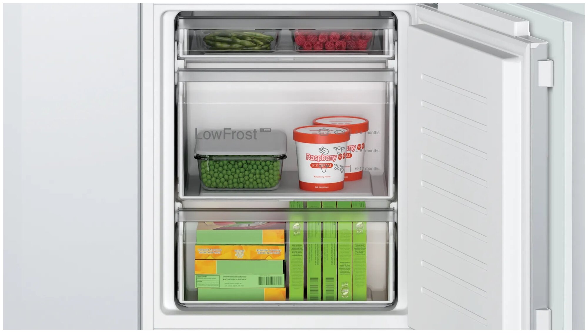 Serie 4, Встраиваемый холодильник с нижней морозильной камерой, Габариты (ВхШхГ) - 177,2х54,1х54,8 см, плоские шарниры, объём 265 (182+83) л, LowFrost, продвинутая электронная панель управления, Зона свежести VitaFresh для овощей и фруктов с регулировкой