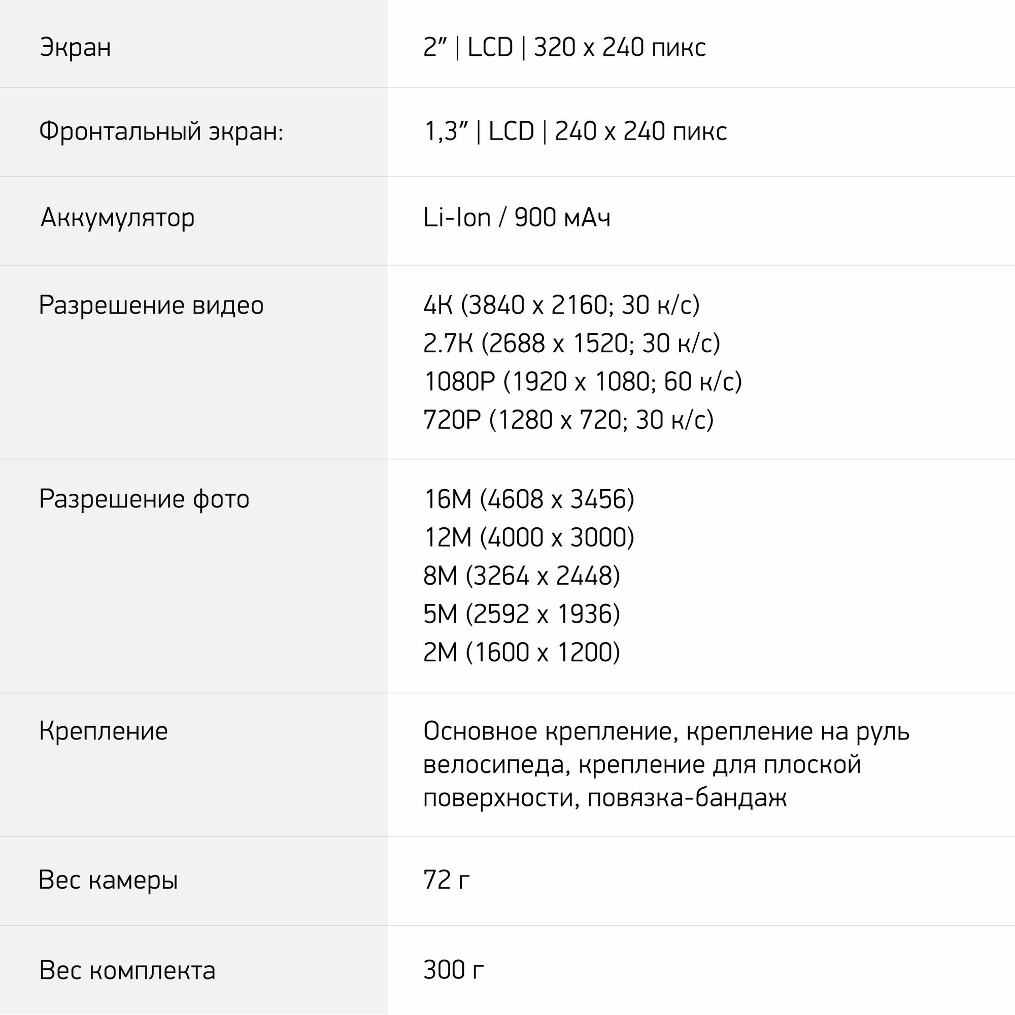 | Комплектация | водонепроницаемый бокс, основное крепление, крепление на руль велосипеда, крепление для плоской поверхности, адаптер-кронштейн 1, адаптер-кронштейн 2, рамка, повязка-бандаж, дополнительный скотч 3М, батарея, USB-кабель, руководство пользователя |