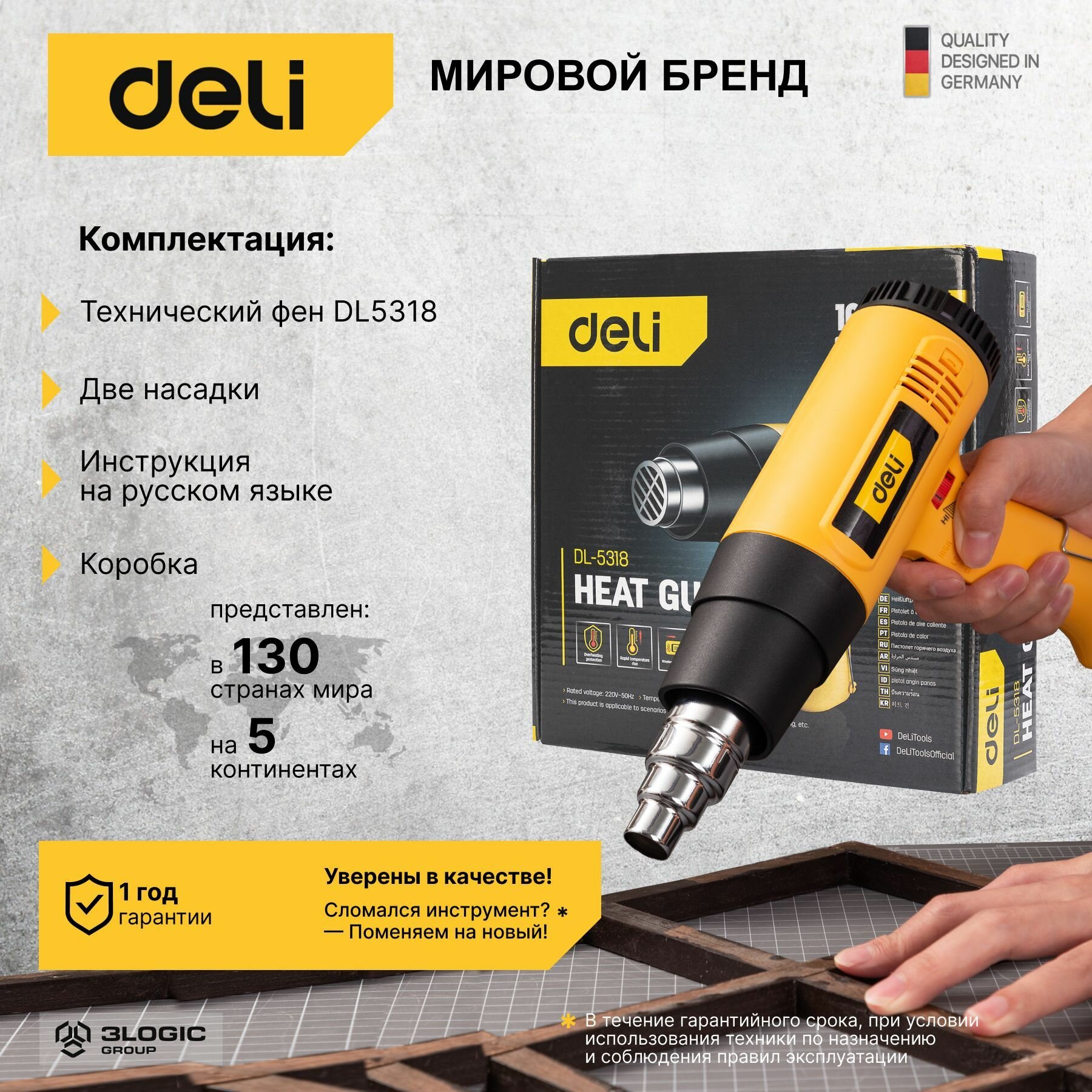 Купить Термопистолет сетевой (технический фен) Deli DL5318 (1600Вт, рабочая температура 100.590 град, плавная регулировка)